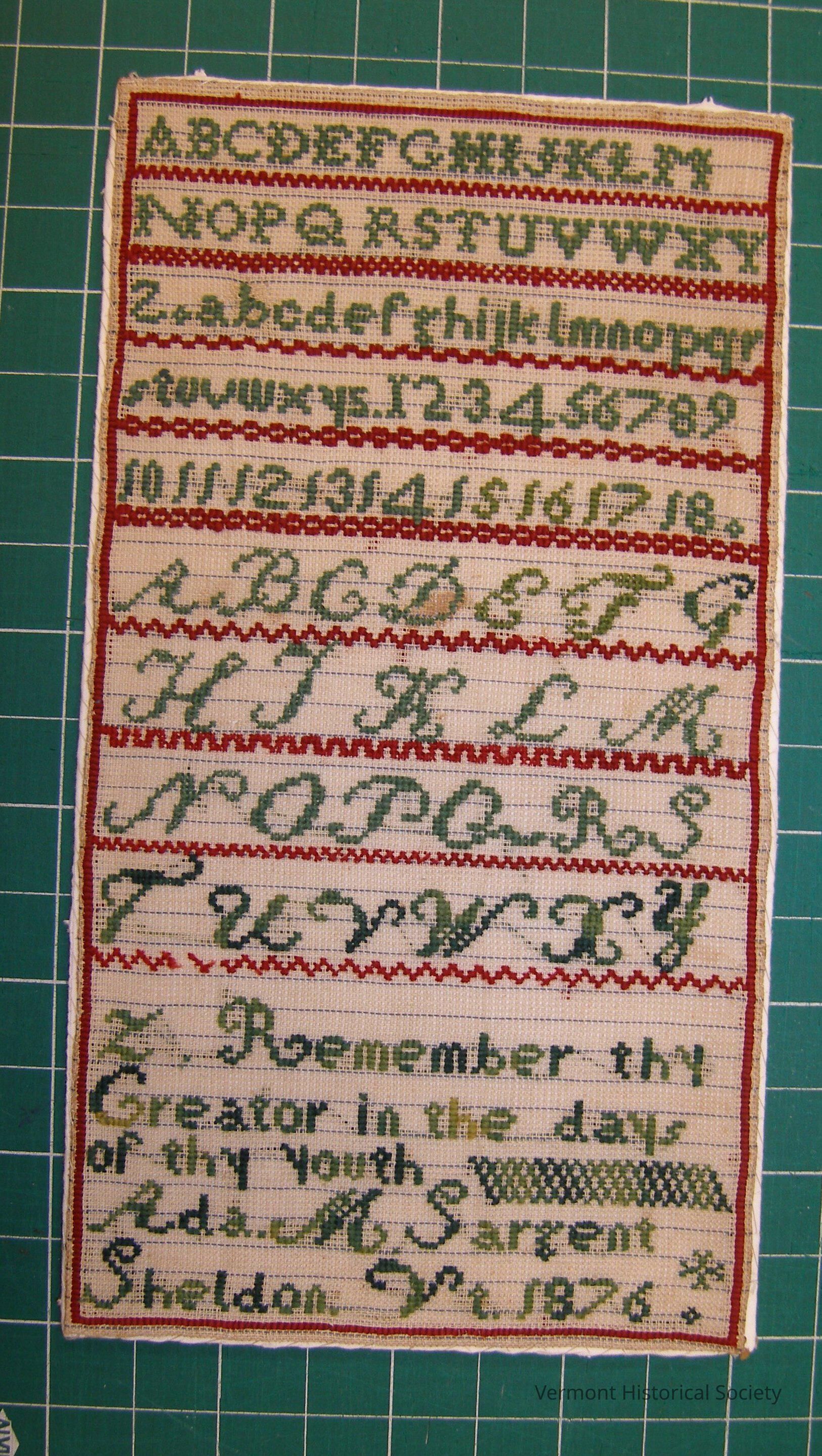 1876 sampler made by Ada Mae Sargent (1867-1951) of Sheldon, VT. All rows of dark green cross-stitched letters and numbers are each divided by a row of red stitching. The first two rows is the upper-case alphabet; the next three rows are lower-case alphabet and numerals. The next four rows are cursive capital letters with the letter Z in the next row followed by the quote: "Remember thy Creator in the days of thy youth" and the last two rows: "Ada M. Sargent/ Sheldon, Vt. 1876" Sampler is worked on cross stitch or needlepoint canvas and at a much later date, the edges were folded under and stitched to a muslin-covered backing and framed in a wooden frame.