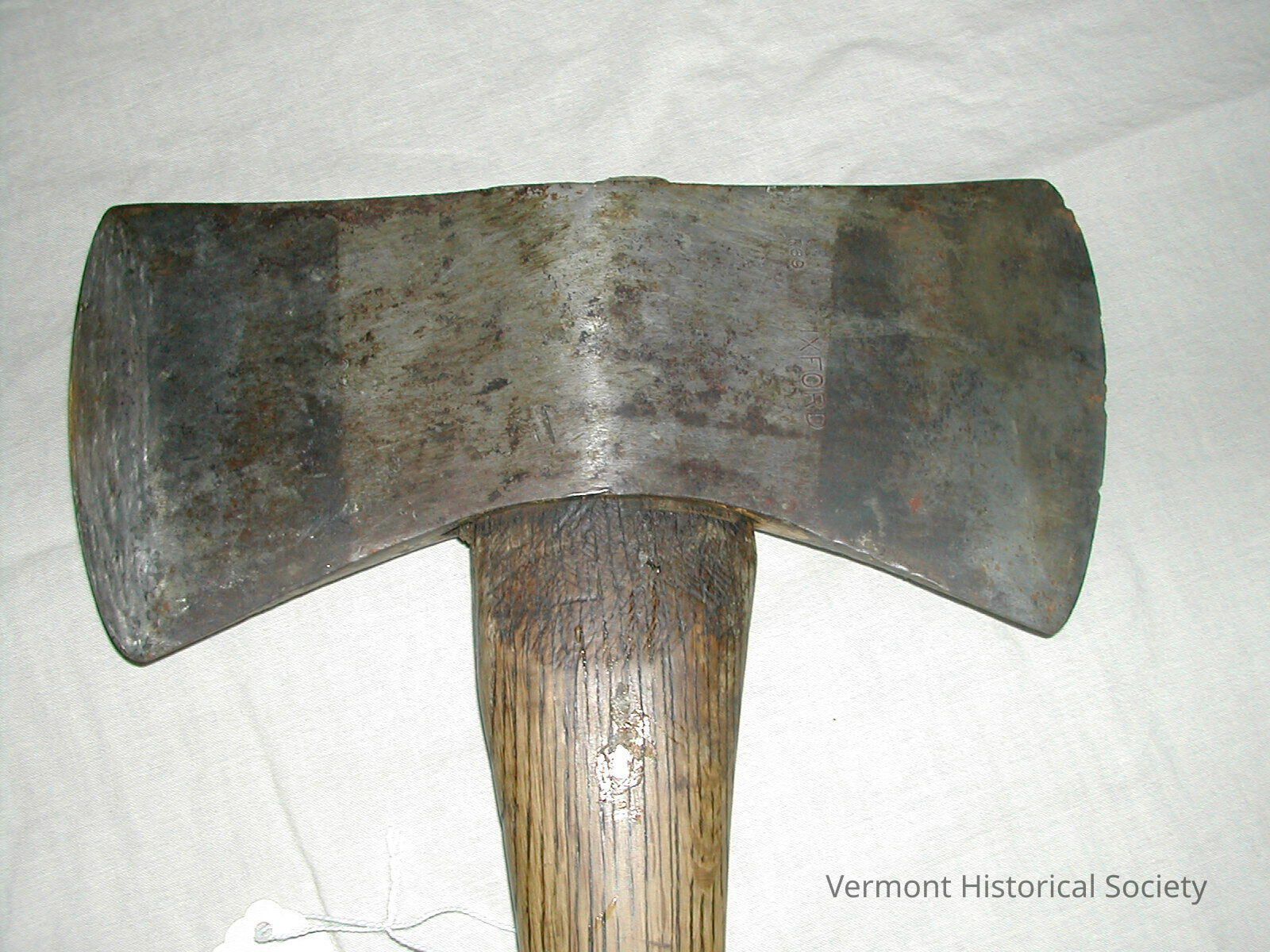 Double-bitted axe with wooden handle. The blade is sharpened on both sides with the handle inserted in the center. The far end of the handle flares out.Context