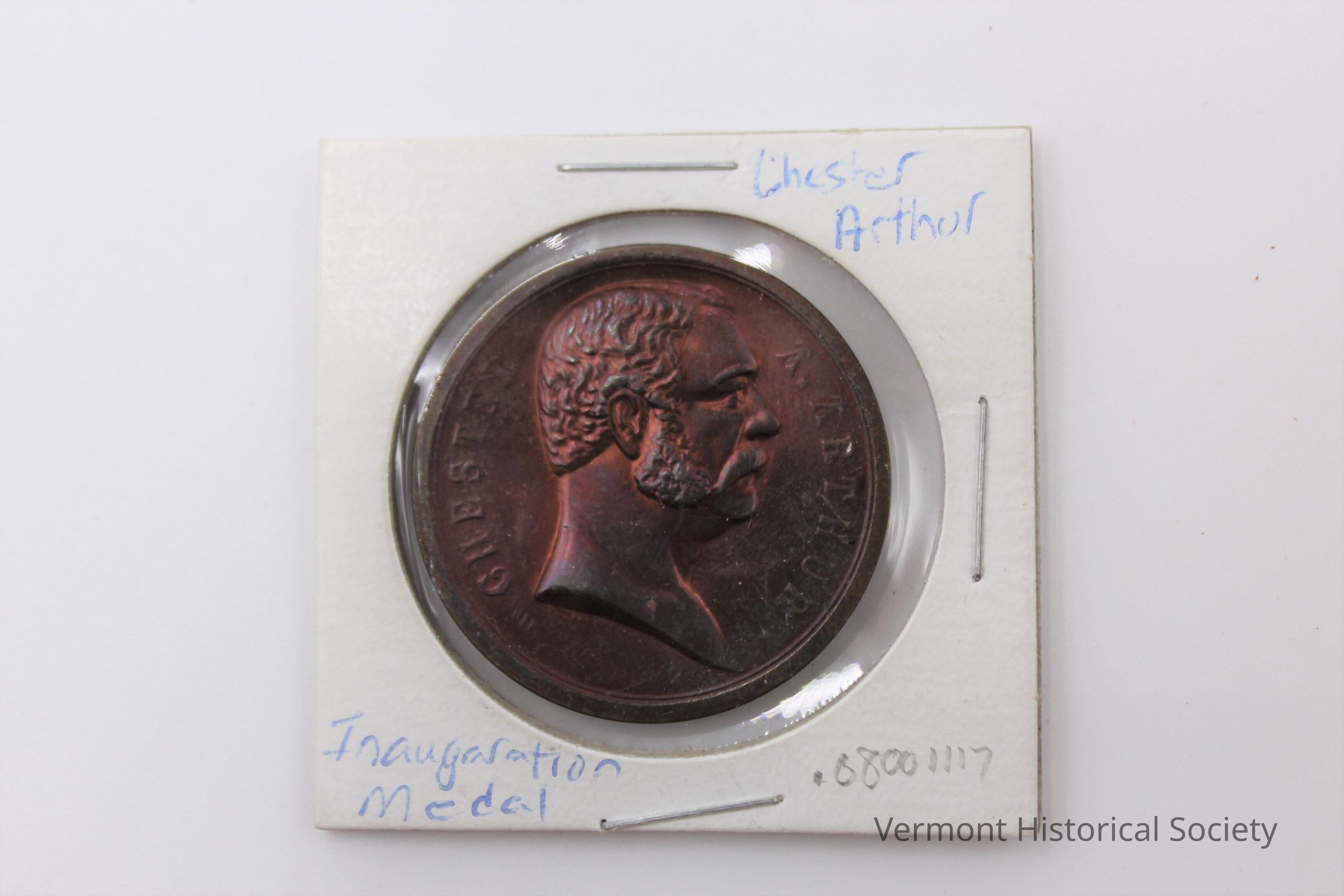 Medal commemorating Chester A. Arthur's inauguration. The face shows a profile image of Arthur with large muttonchops and the words "CHESTER A. ARTHUR" around the edges. The reverse shows the words "INAUGURATED/SEPTEMBER 20/1881" surrounded by laurels with the words "PRESIDENT OF THE UNITED STATES" around the outer edge.