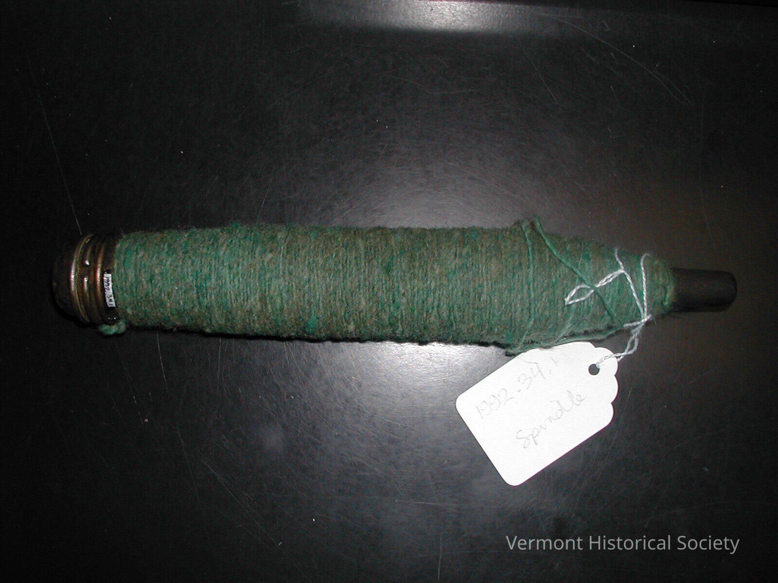 Wooden spindle wound with green wool thread or yarn. The bobbin has a turned, round knob at one end and terminates in a post on the other end.