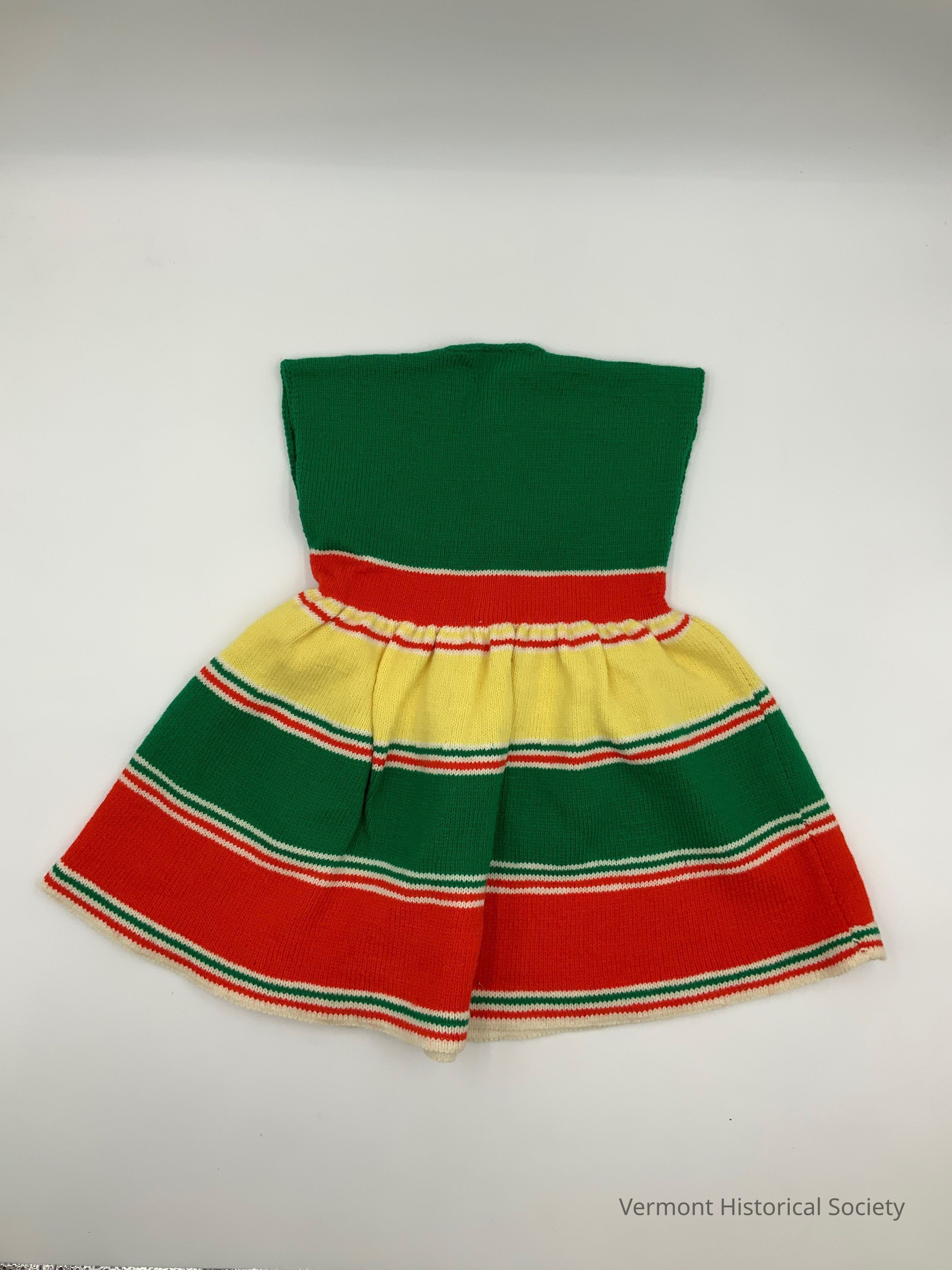 Knitted child's dress in green, yellow, and red. The bodice is green, with no sleeves. The skirt has wide horizontal stripes separated by narrow stripes. There are 5 plastic buttons securing it closed down the center back.