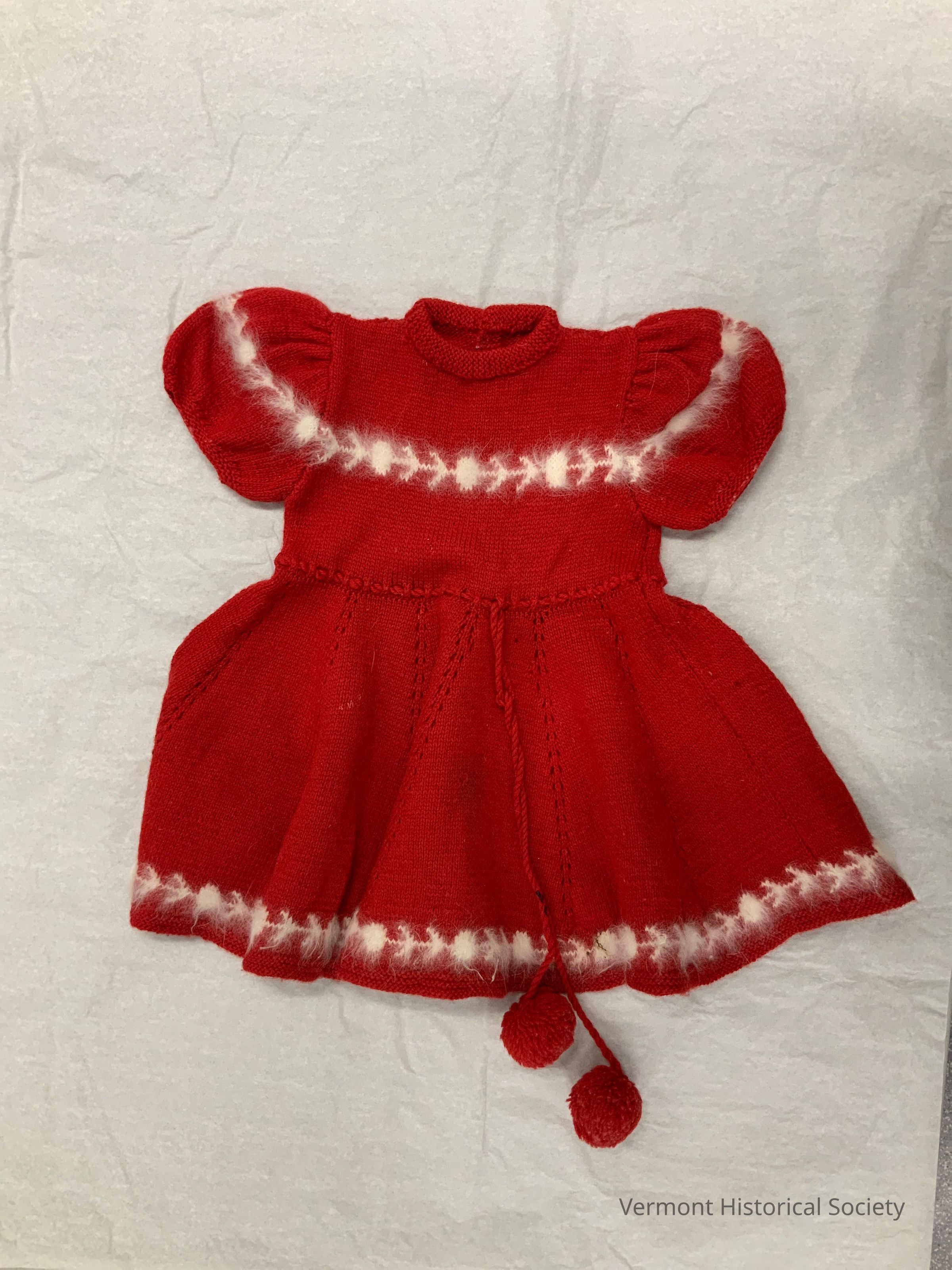Child's knitted red dress with white angora trim. The dress has an A-line skirt, and short, puffed sleeves. The white itaglio design stretches horizontally along the bottom of the skirt, and the center of the bodice and sleeves. The bodice secures up the center back with a row of 4 red plastic buttons.Context