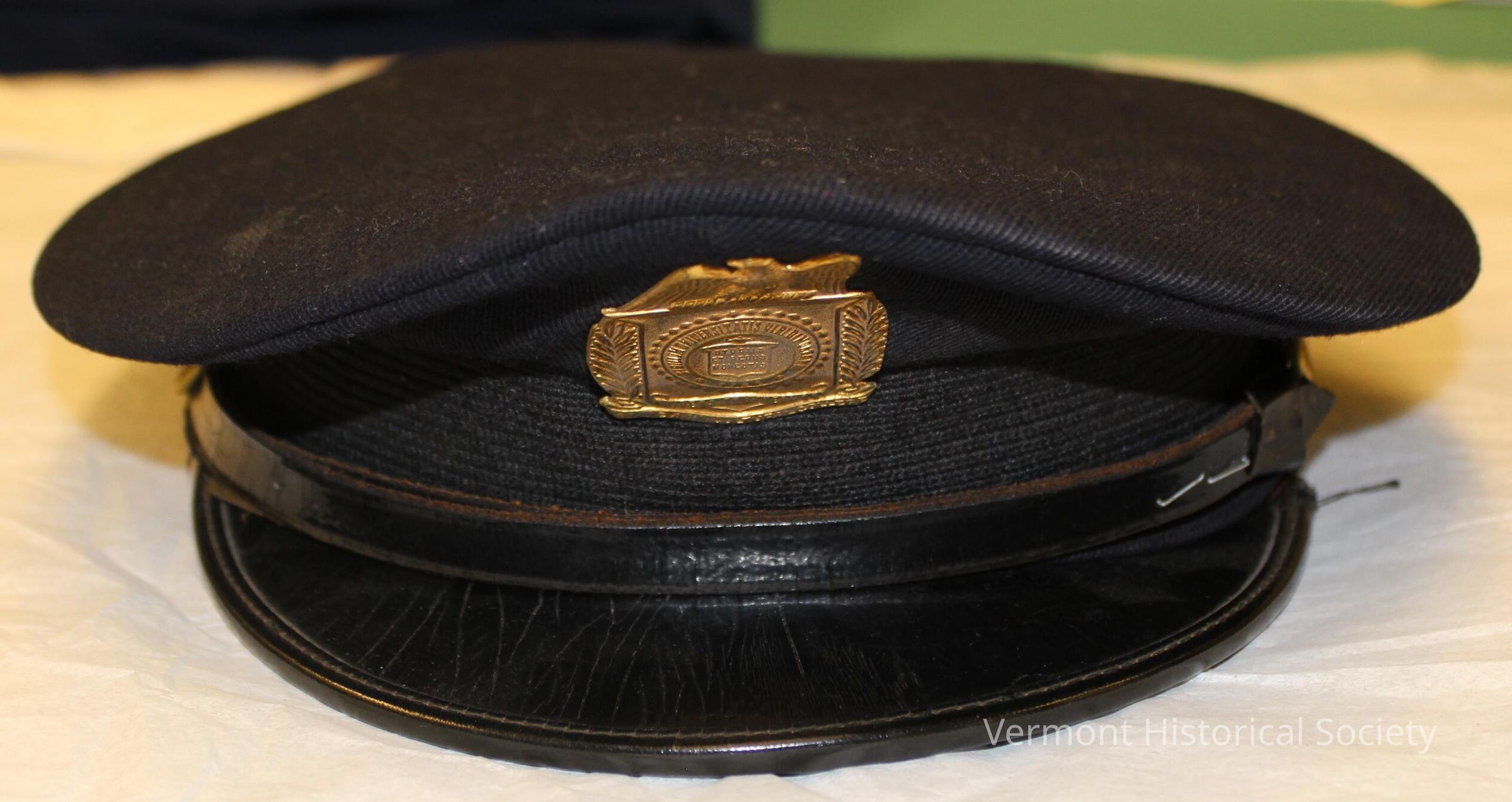 Navy blue military-style hat consisting of a flat raised crown and a black leather brim. There is a brass badge at the center front with an eagle atop it that bears the inscription, "University of Vermont, State Agricultural College." Inside the hat there is a cotton label inserted into a plastic cover that reads, "Sigmund Eisner Co. Uniforms and Clothing RED BANK, M. J. / Name L. Lisai / 6 3/4 / H4924".Context