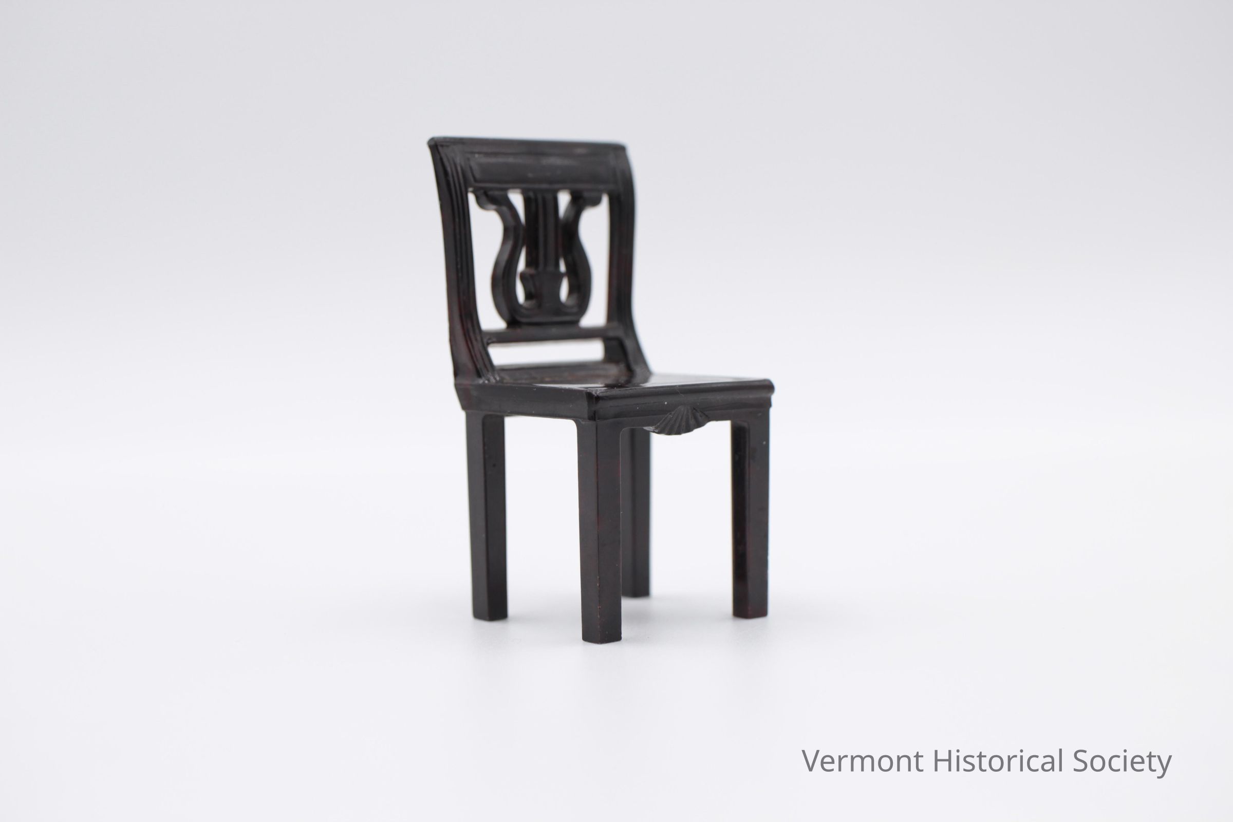 Miniature brown plastic side chair. The chair has straight, square legs and a square seat. The back has a lyre-shaped splat. The chair is part of a matching set of four.Context