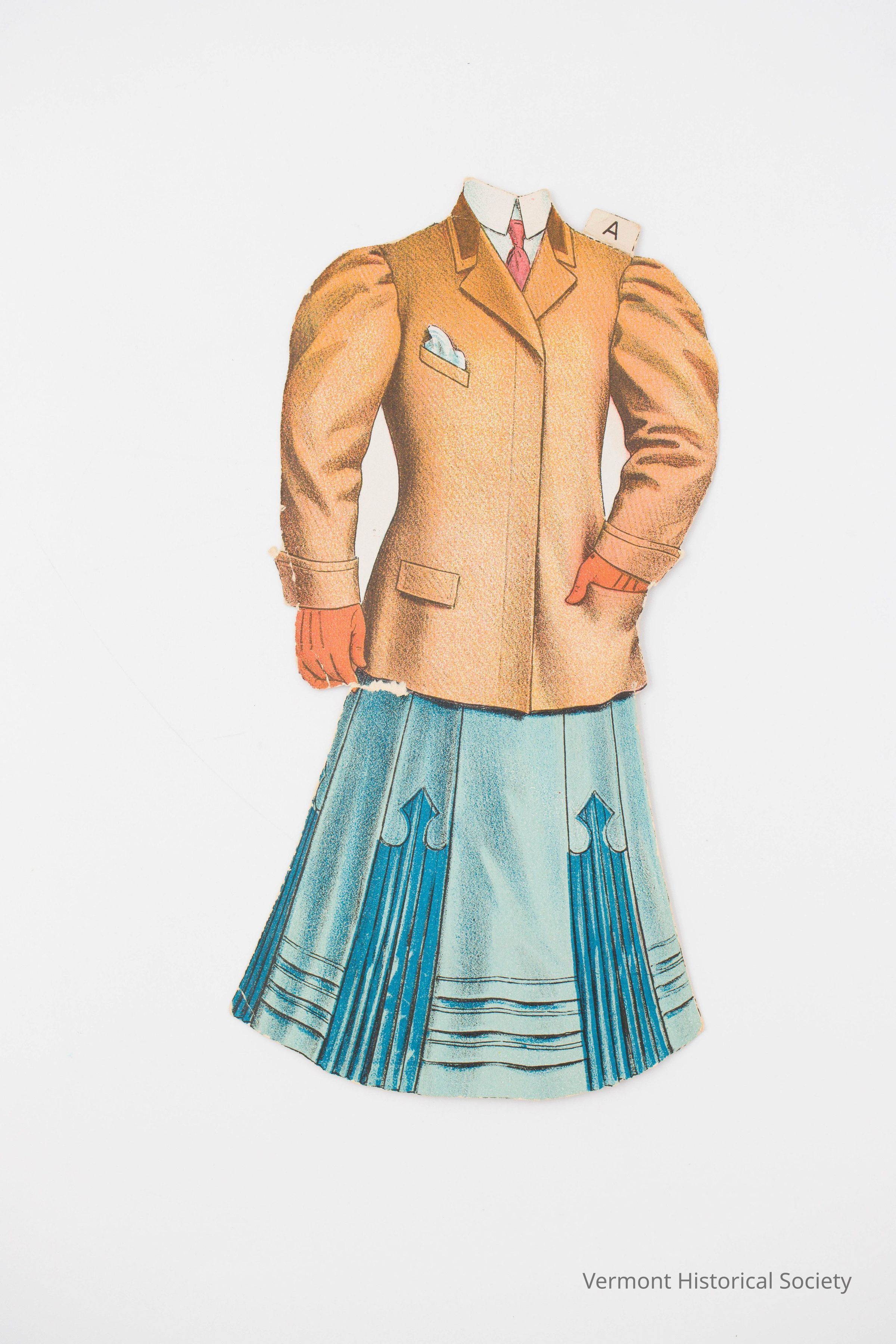 Walking outfit for a paper doll. The outfit consists of a brown coat, white shirt, pink tie, and blue pleated skirt.Context