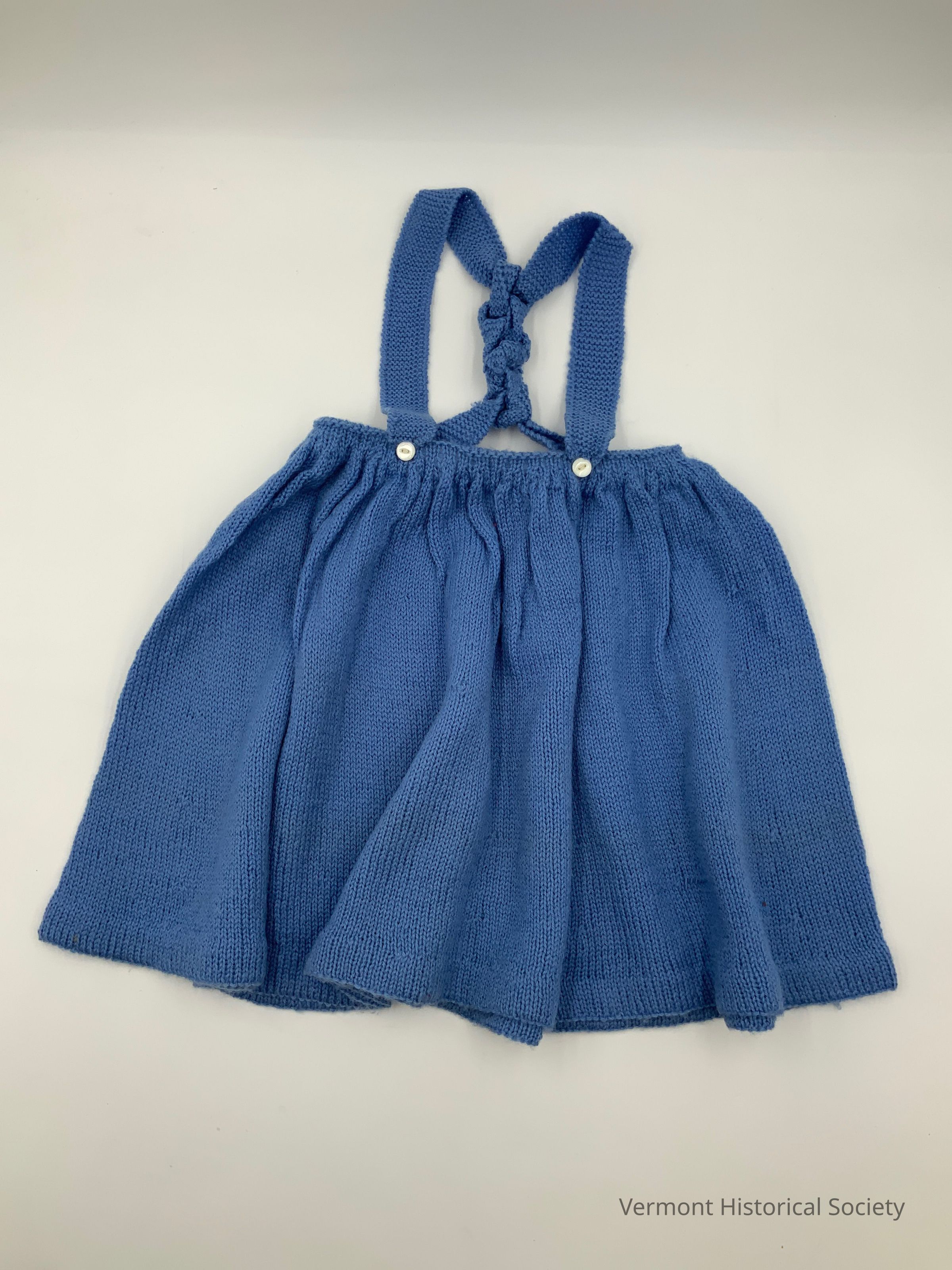 Child's blue knitted skirt. There are 2 blue suspenders that attach to the front waistband with 2 white plastic buttons. The suspenders are knotted together 5 times in the back.Context