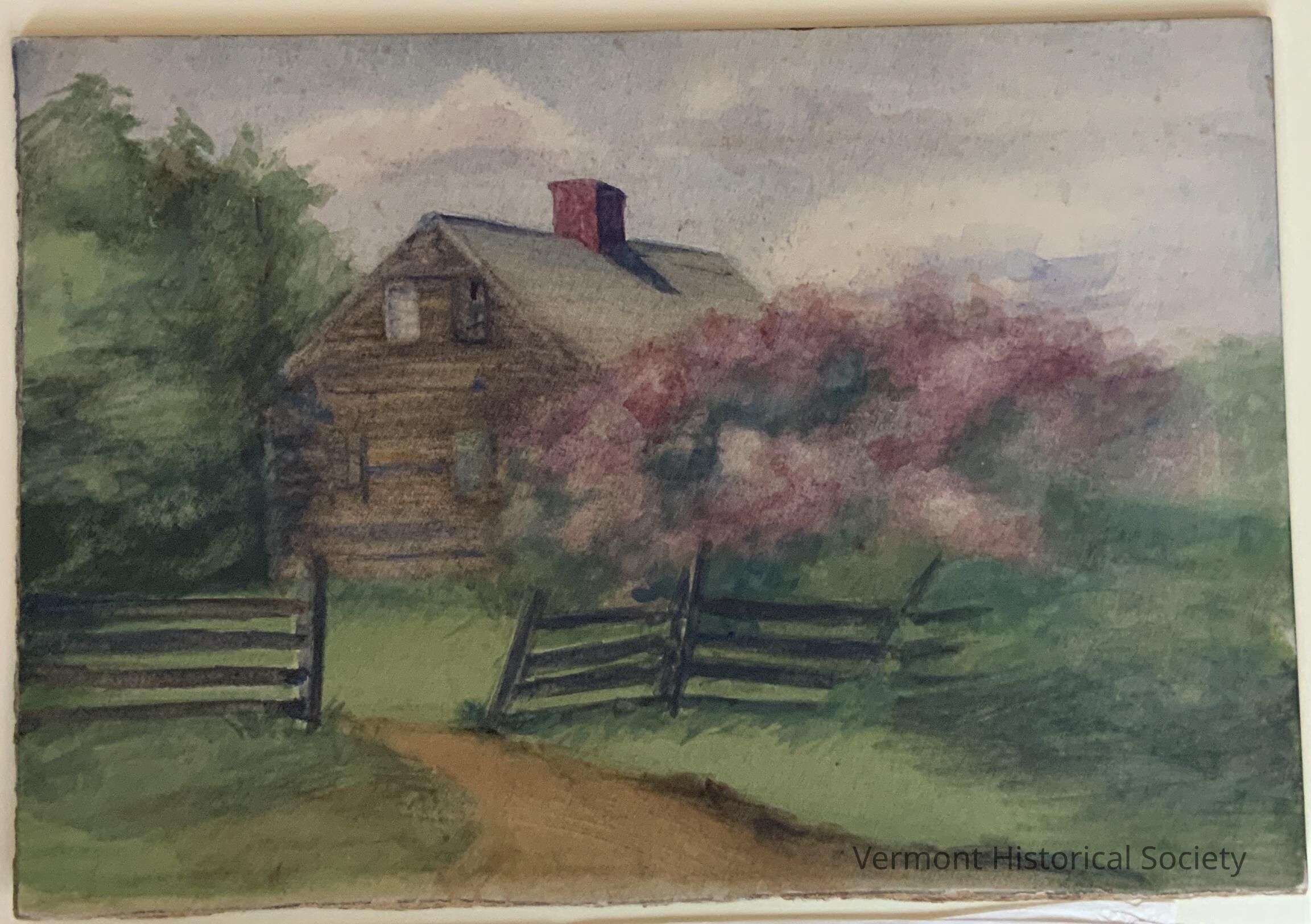 A painting of a small cabin surrounded by a fence and next to a forest. There is a large pink shrubbery blocking part of the house. It is painted on cardboard and unsigned and undated.Type of Painting
