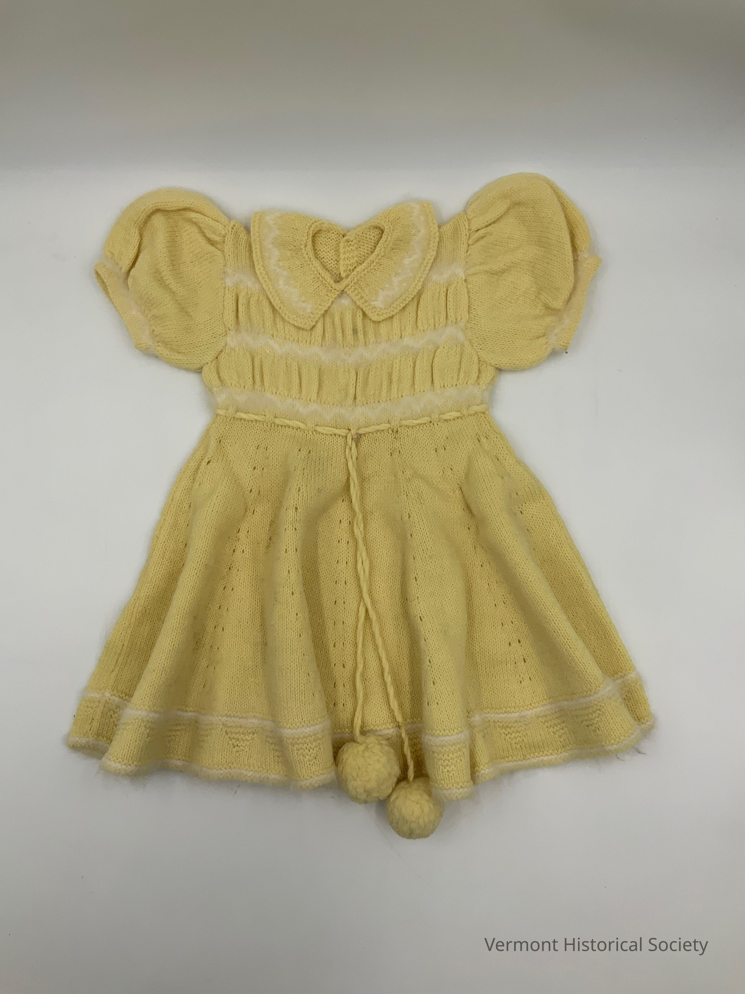 Yellow knitted child's dress with short, puffed sleeves and a falling collar. The bodice is in horizontal bands of ruching, with chevron lines of white angora between each band. It has an A-line skirt that is decorated with 2 lines of angora trim along the hem. There is a yellow yarn drawstring at the waist with a large pompom on each end. The bodice secures at the center back with 4 yellow plastic buttons.Context