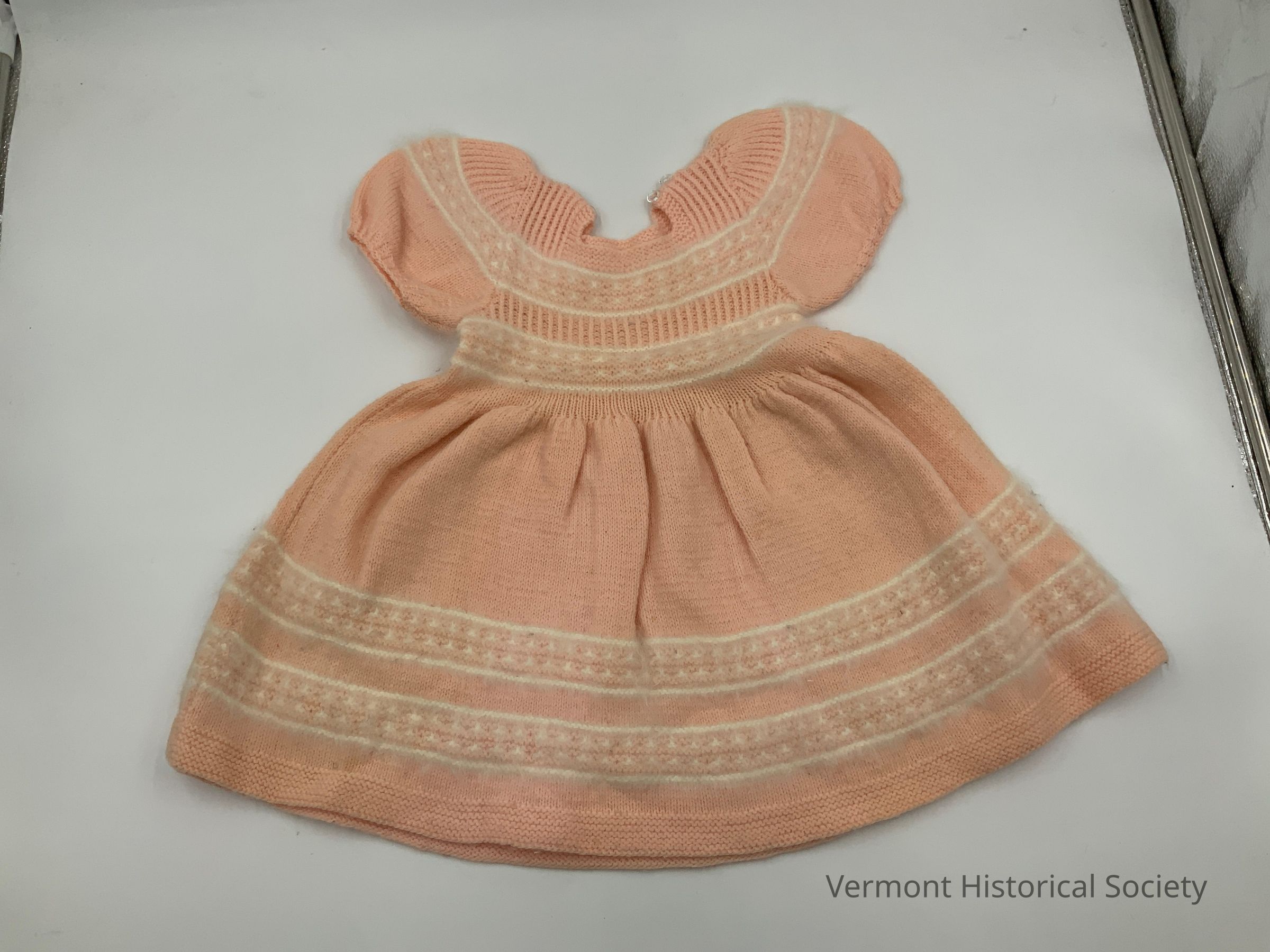 Pink knitted child's dress with short, puffed sleeves and a full skirt. The skirt and bodice are decorated with horizontal bands of white angora.Context