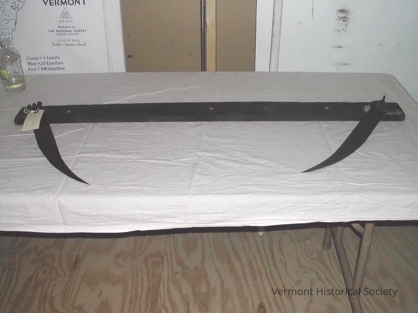 Large metal calipers consisting of a metal board with two curved and metals pointed attachments at either end. The attachments are secured with bolts loosely enough to be adjustable.Context