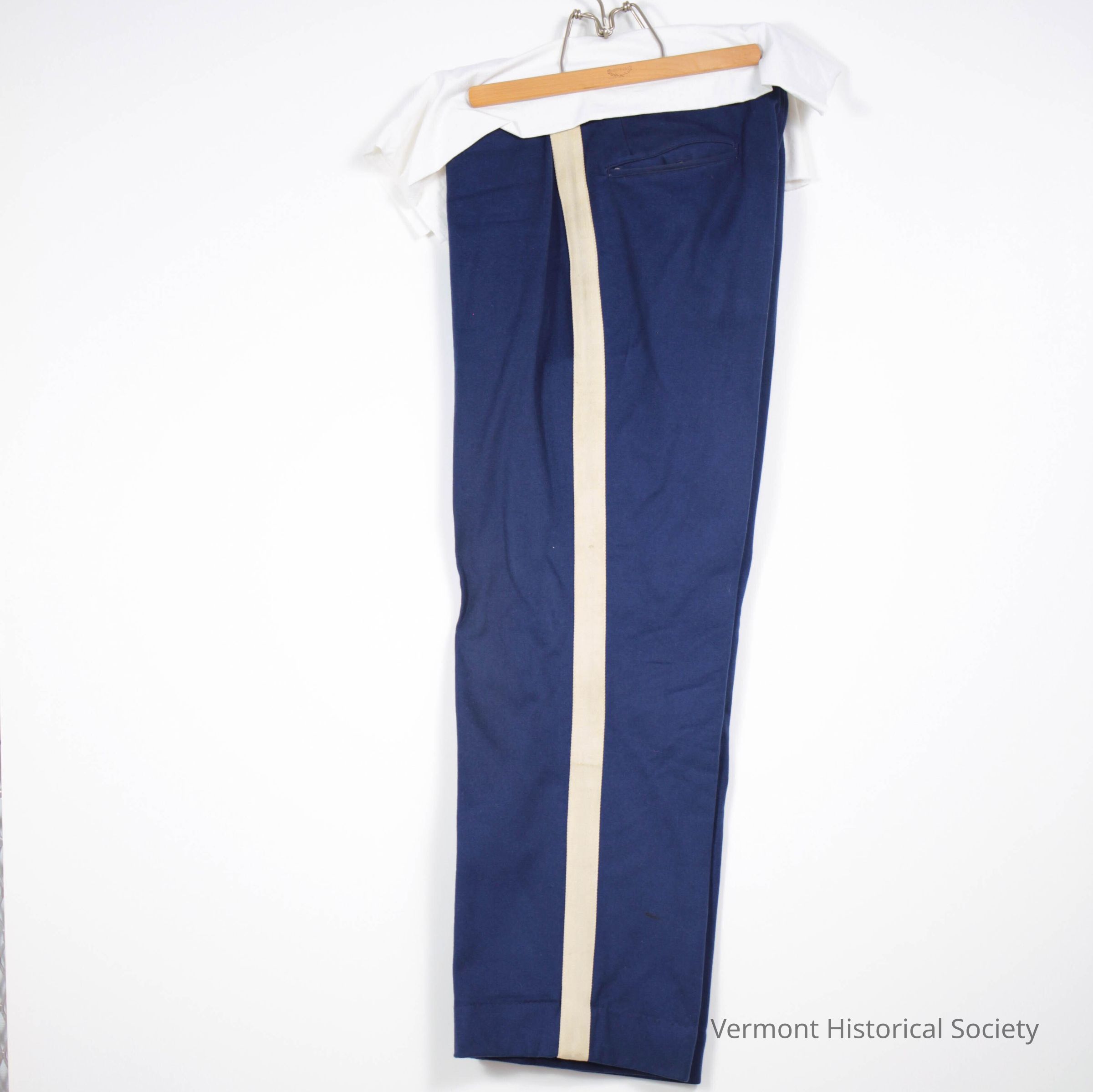Blue wool ROTC uniform pants. The pants are accented on the sides with a stripe of white canvas appliqued onto the side seams. There are two side pockets and two back pockets. There are two white plastic buttons on the inside of the waistband on either side of the back seam. The pants secure with a center front fly, held with four black buttons. The waistband has belt loops. On the underside of the shallow right front pocket is a label with the printed inscription, "Sigmund Eisner Co. Uniforms and Clothing RED BANK, N. J." The bottom half of the label has the handwritten inscription, "Webster O. Krupp #132 W32 H1153".Context