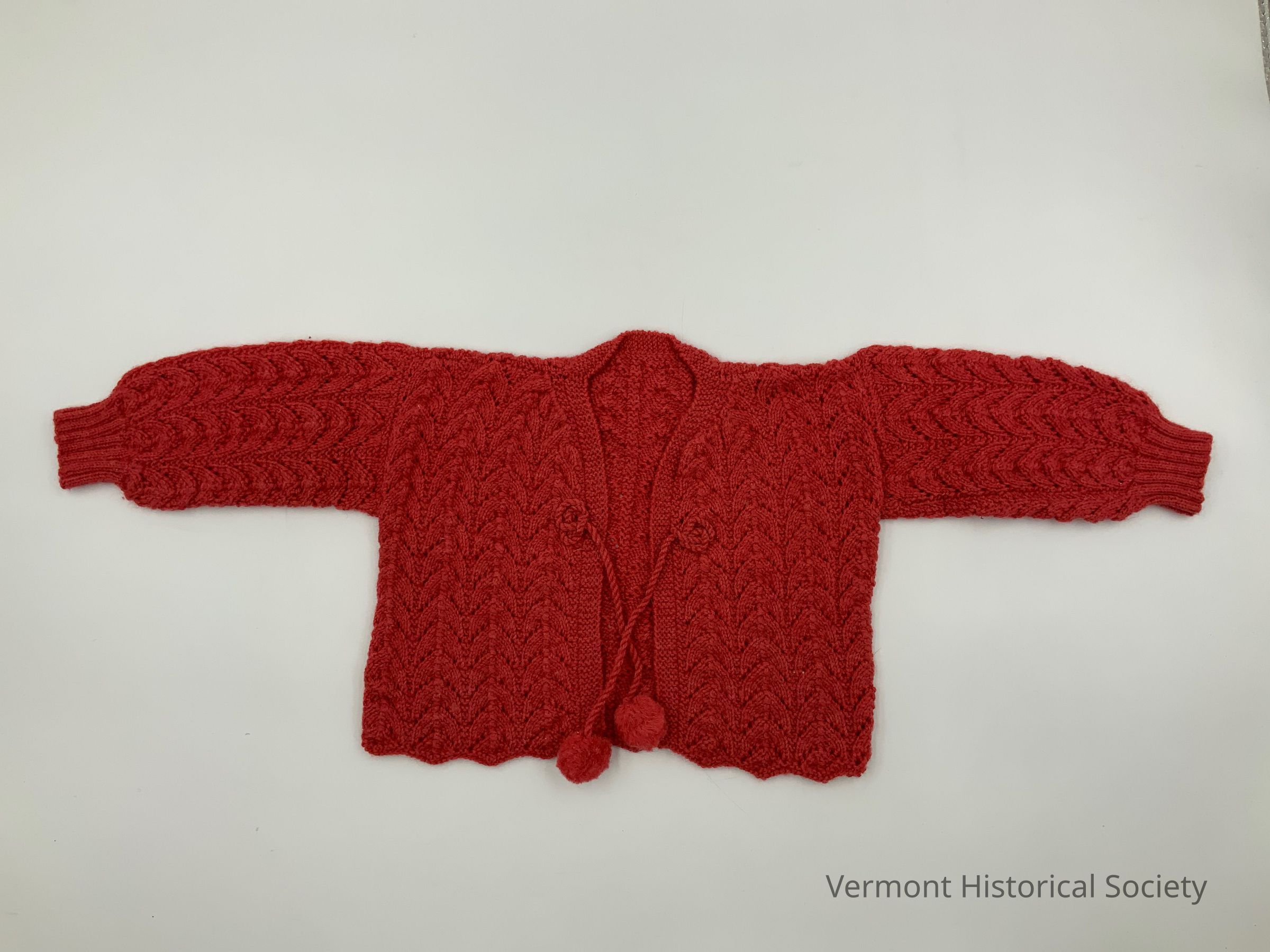 Red child's sweater knitted in a textural pattern of repeating feathers or leaves. It opens at the center front. There are 2 frog ties at the center front bustline, with a pompom at the end of each.Context