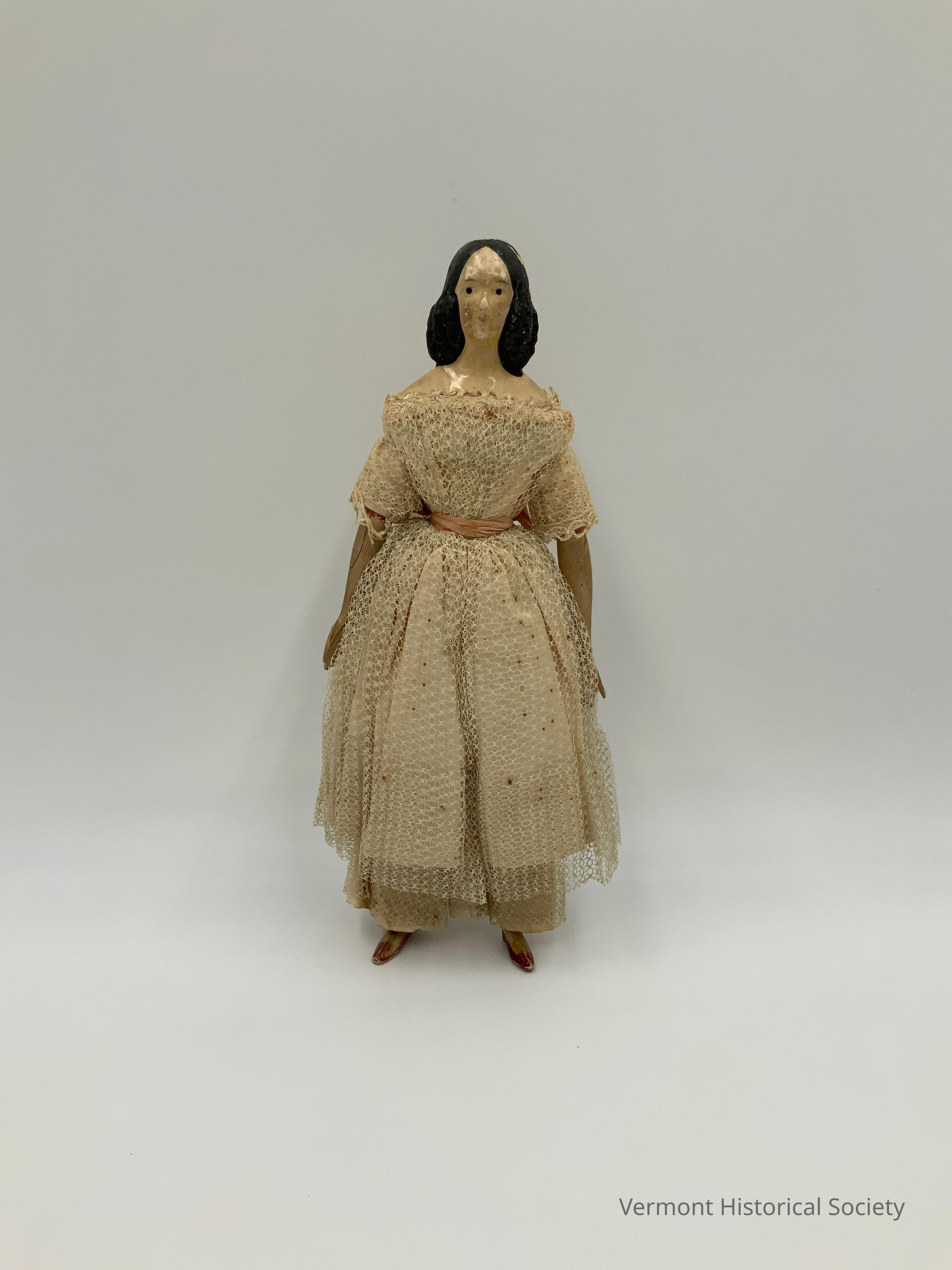 Doll with a soft body and wood bust, arms, and legs. The bust is plastered and painted with cream-colored skin and black hair. The hair is molded to be in a bun with loose curls on either side. The face is molded with a nose and has painted-on eyes, eyebrows, cheeks, and lips. The arms and legs are not plastered but are painted with the same color skin. The narrow feet are painted with brown shoes. The doll is wearing a dress made of cream-colored silk covered in matching net. The neckline of the dress sits off the shoulders, and the bodice is gathered toward the center front of the waistband, which is covered with a pink silk ribbon. Beneath the dress, she is wearing long bloomers or pantalets made of the same silk and net as the dress.Context