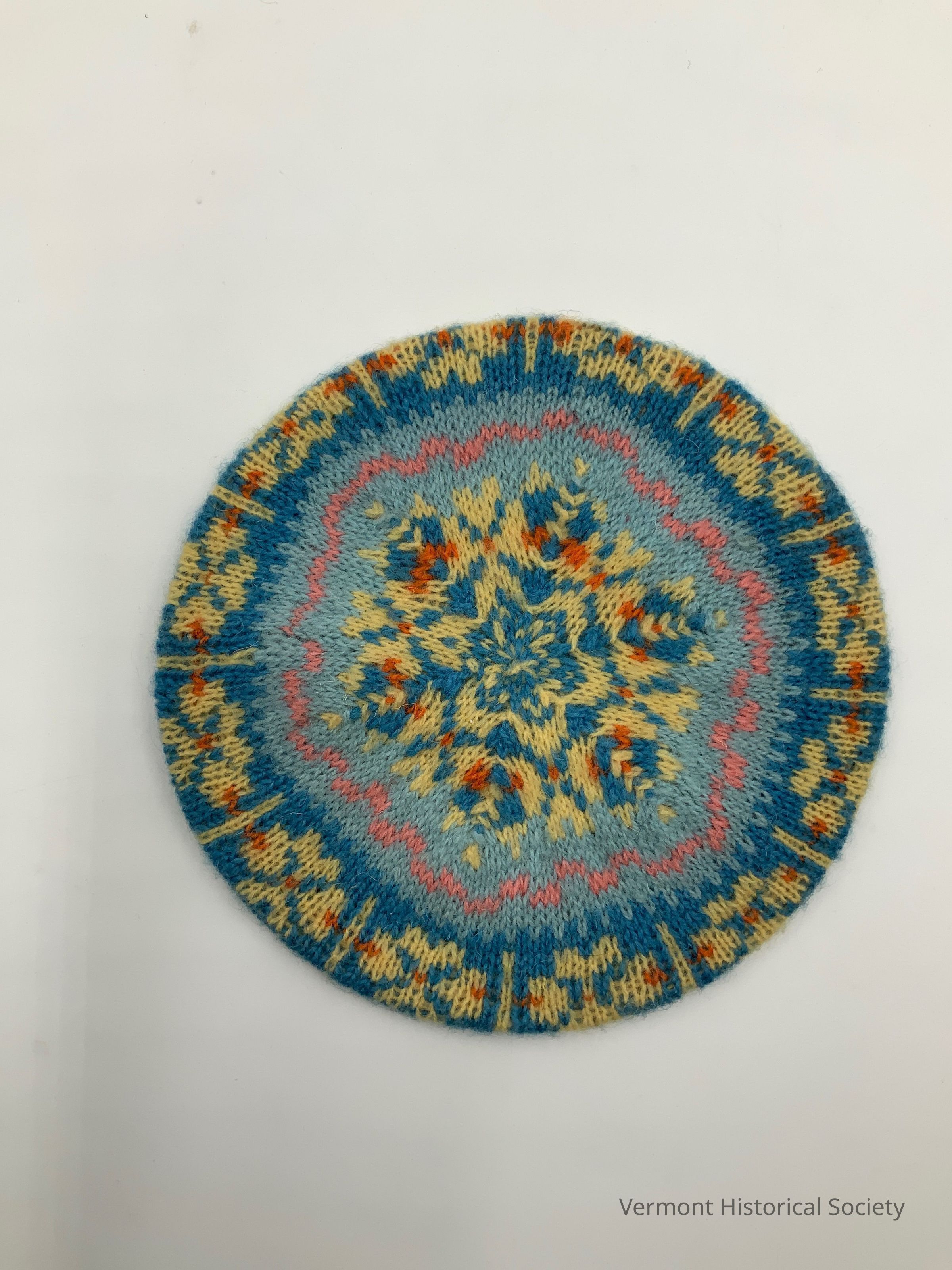 Knitted child's beret with an intaglio snowflake design in blues, pink, yellow, and orange.Context