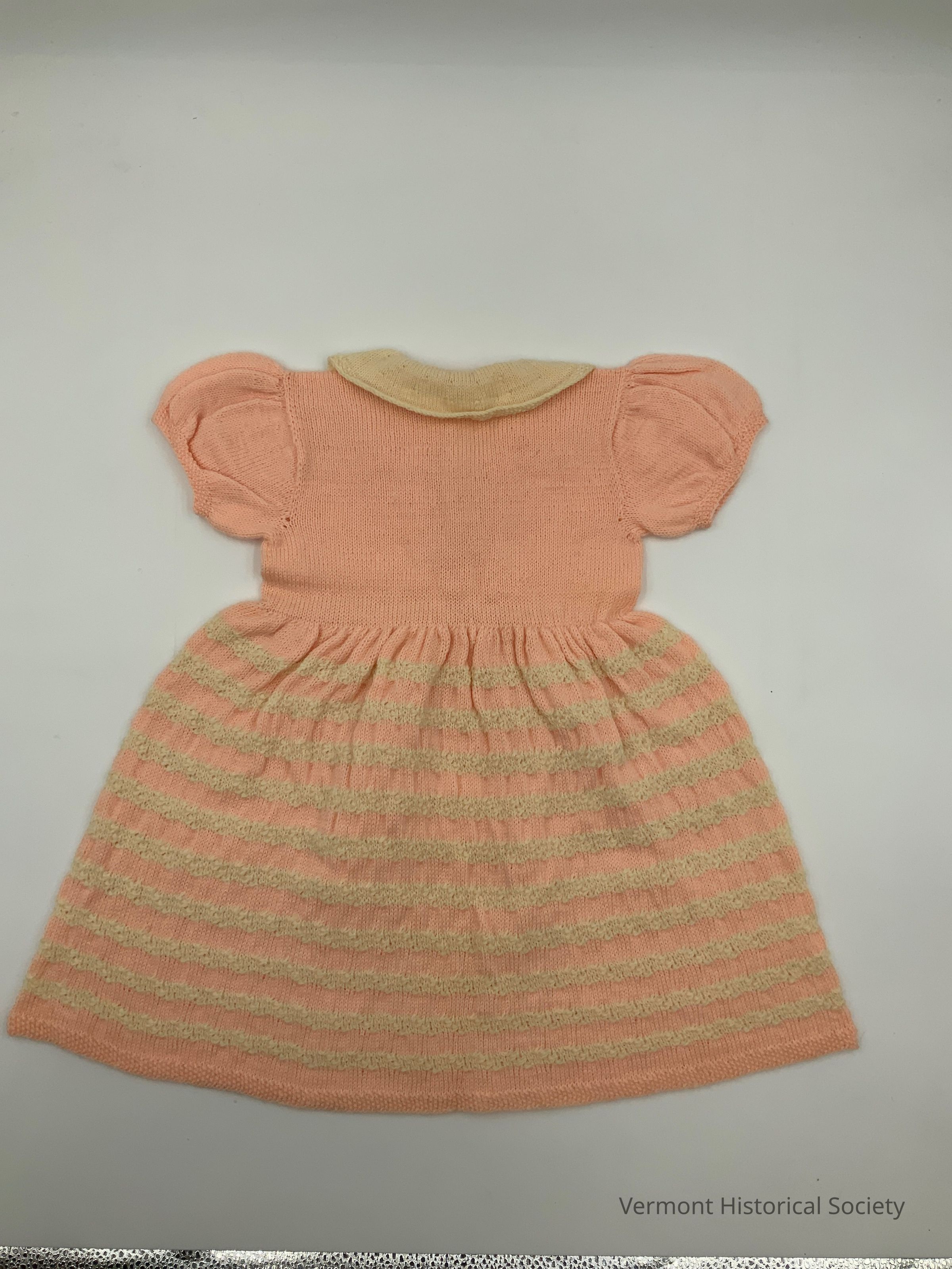 Pink knitted child's dress with short, puffed sleeves and a white falling collar. The skirt is decorated with white horizontal stripes. The bodice secures at the center back with 4 clear plastic buttons.Context