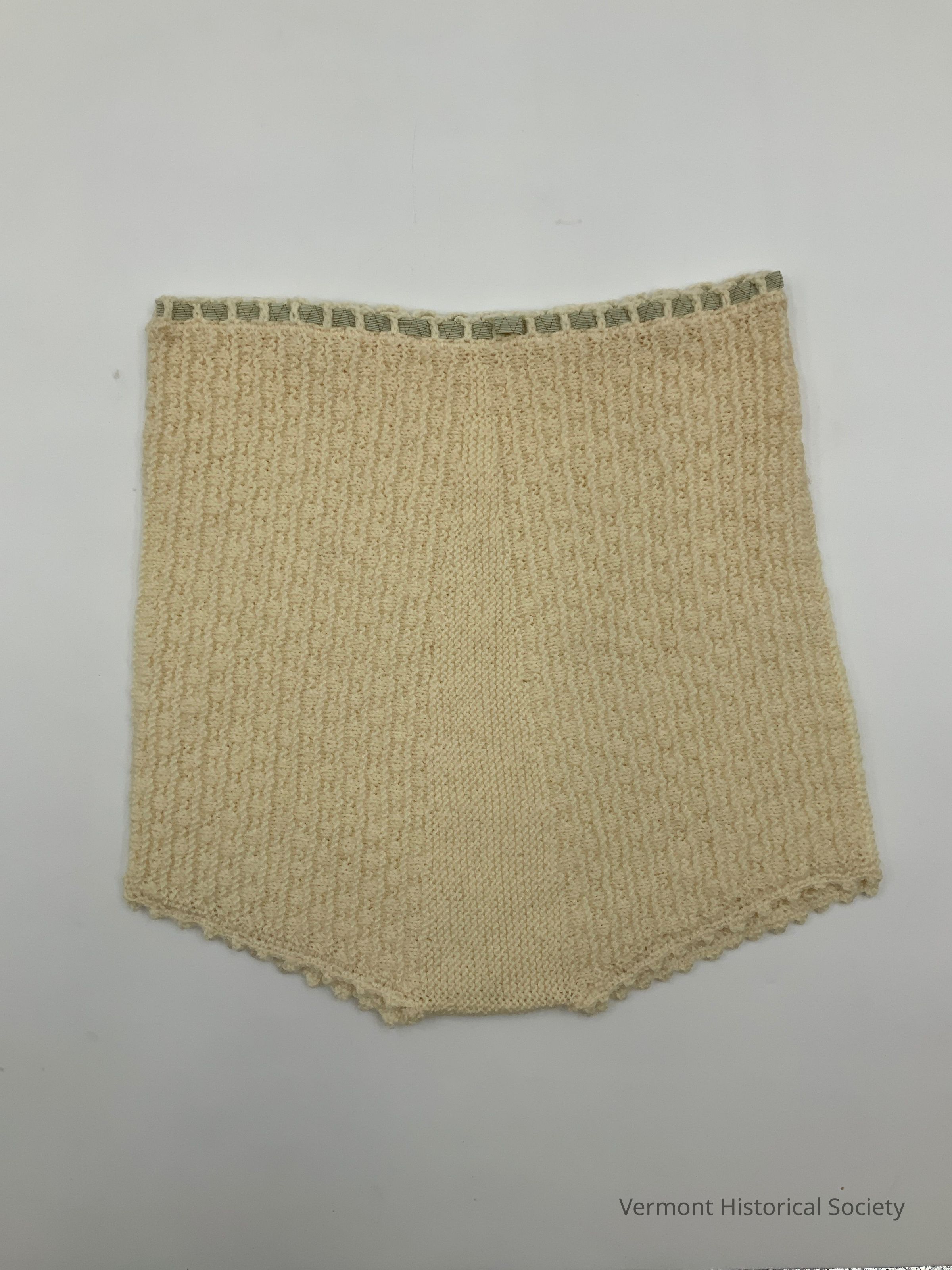White knitted child's bloomers or diaper cover. There is an elastic band woven through the top waist.