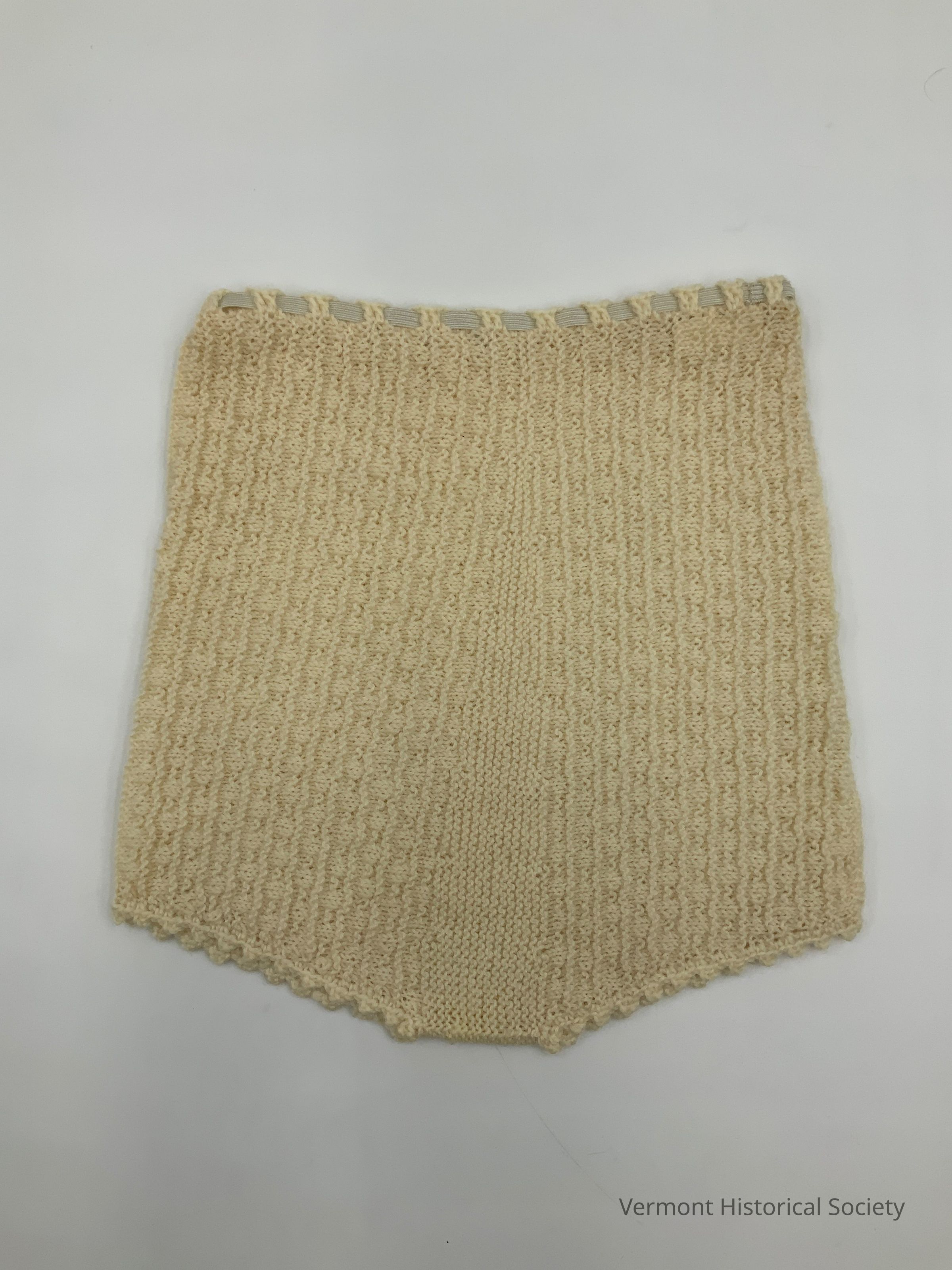 White knitted child's bloomers or diaper cover. There is an elastic band woven through the top waist.