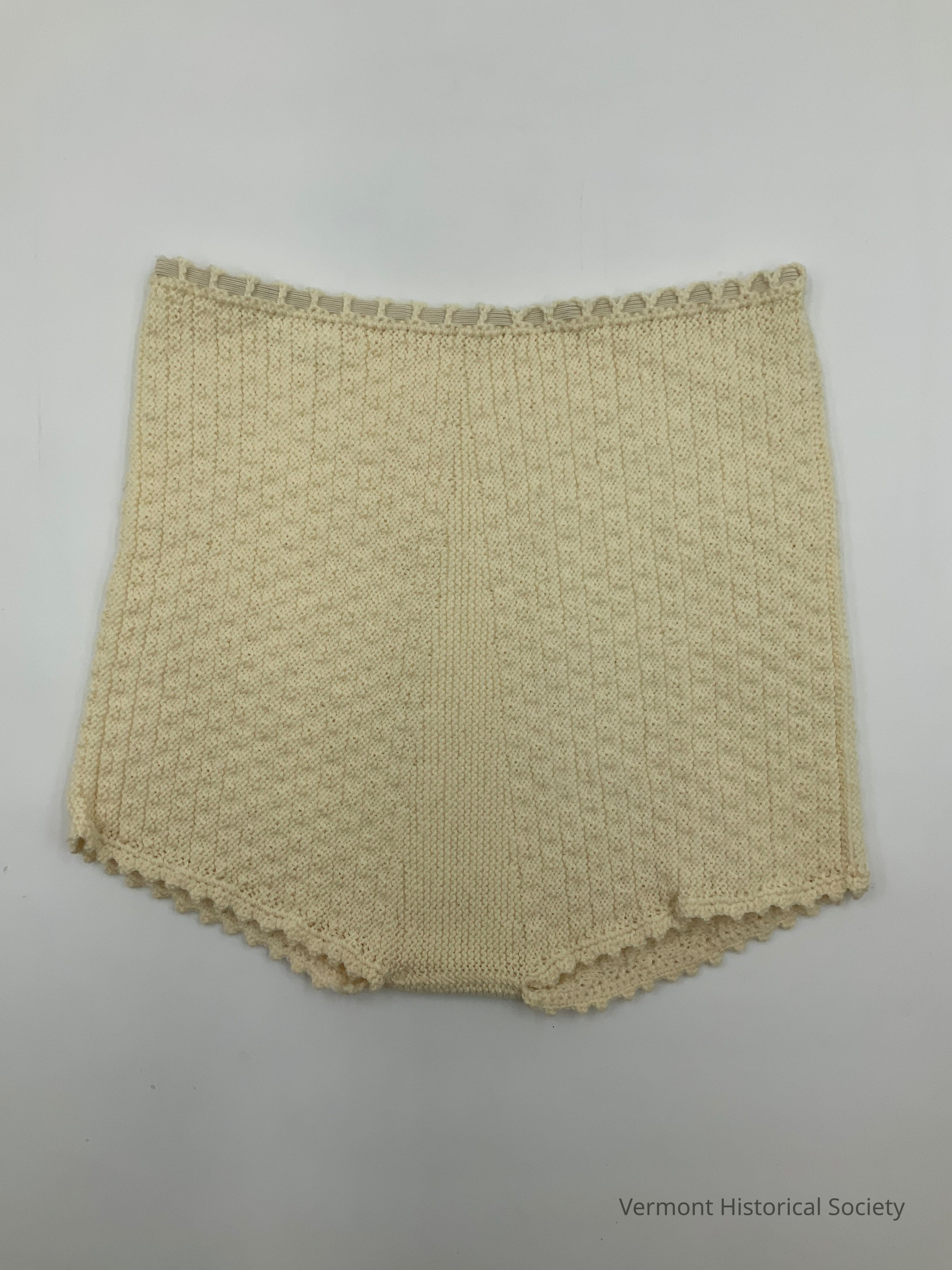 White knitted child's bloomers or diaper cover. There is an elastic band woven through the top waist.