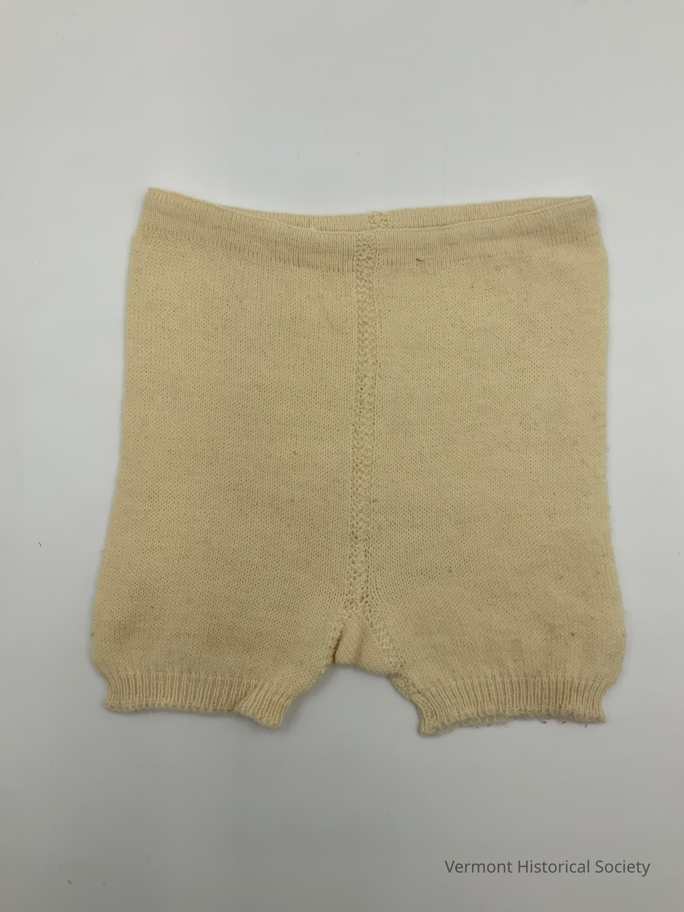 White knitted child's bloomers or diaper cover. There is an elastic band inserted through the top waist.
