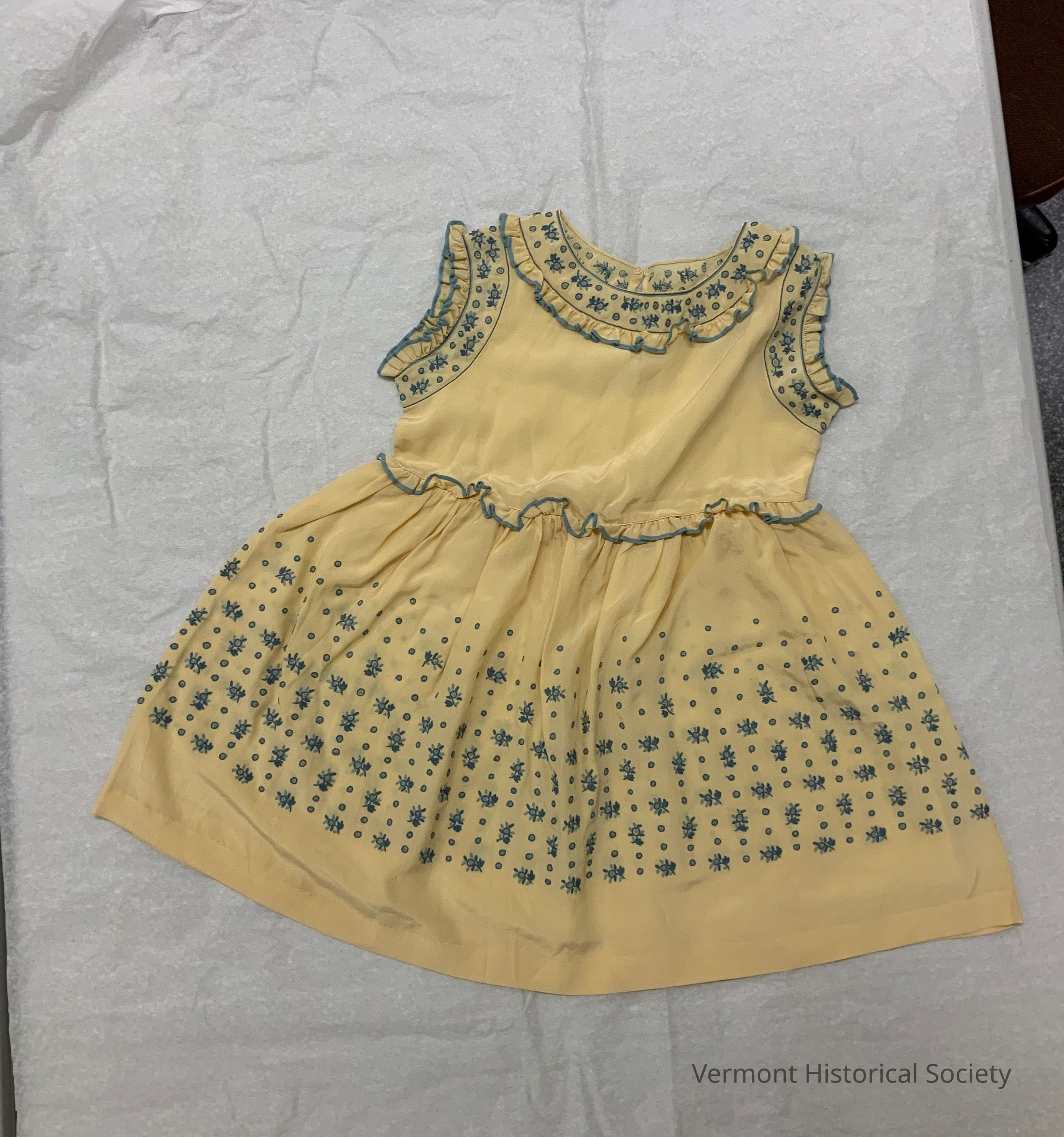 Yellow silk child's dress with blue embroidered decoration. The dress is sleeveless. The embroidered decoration is floral sprigs and is placed around the neckline, armscyes, and in a wide horizontal band around the skirt.Context