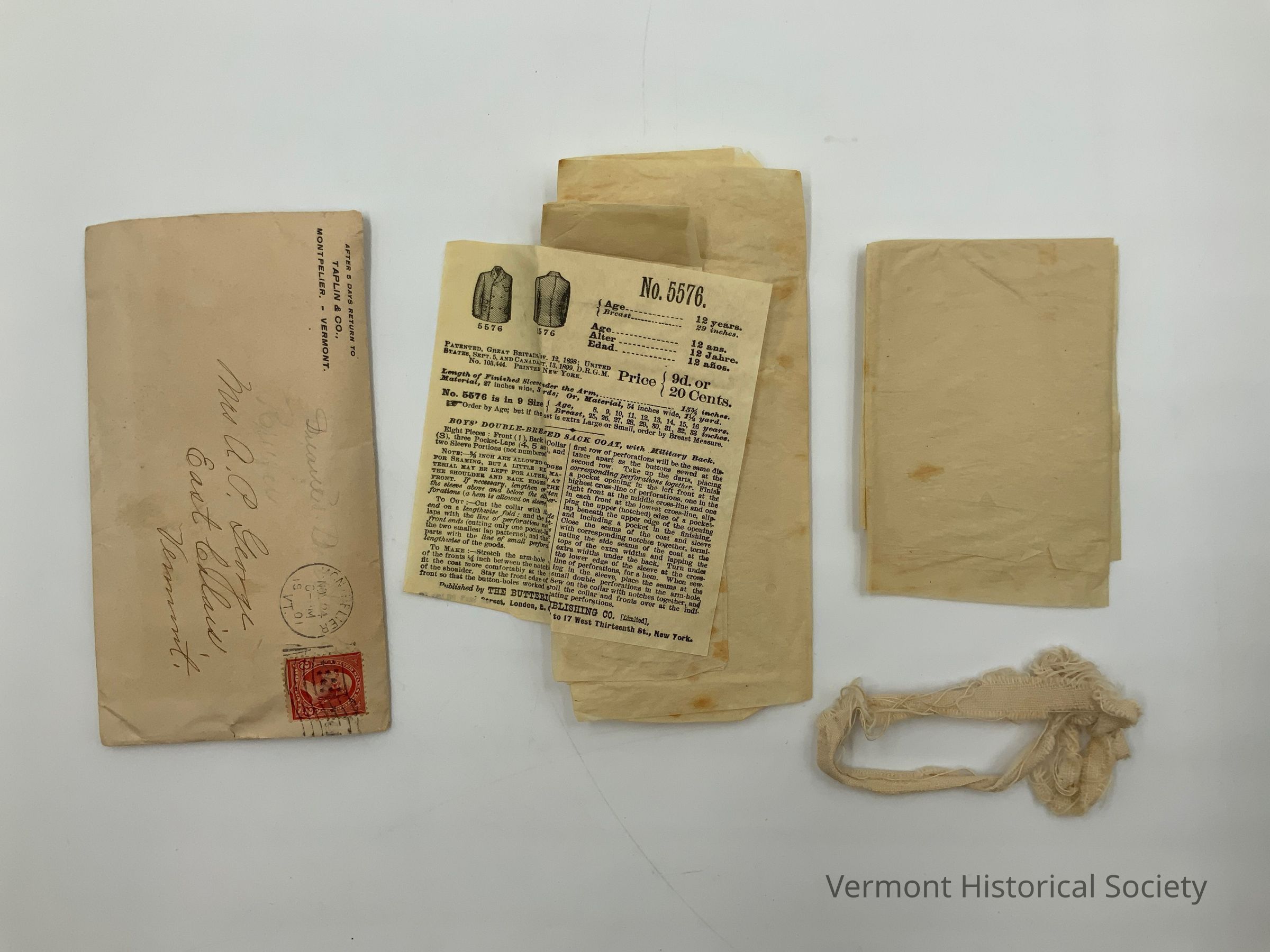 Cut tissue sewing pattern. The pattern is folded into an envelope addressed to "Mrs. A. P. George / East-Calais, Vermont." and return marked for Taplin & Co. in Montpelier, Vermont. The pattern comes with an explanatory page printed with sewing instructions and an illustration of the garment ("Boys' Double-Breasted Sack Coat"). The label "Duane's Double-Breasted R[illeg]" is written on the envelope in pencil. The group was tied together with a strip of white cotton.Context