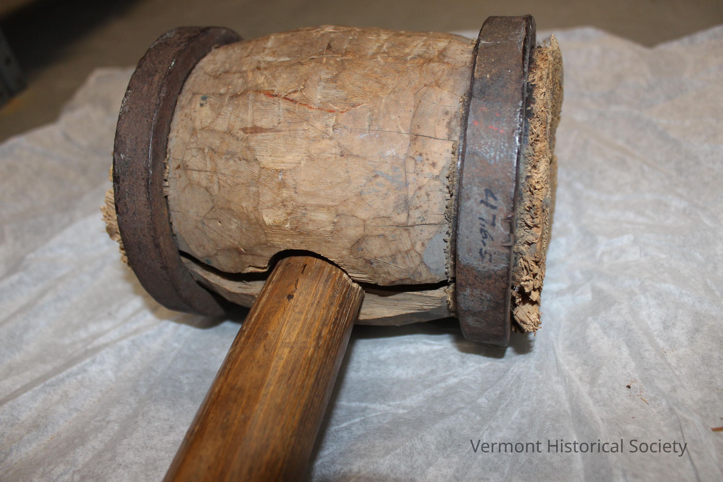 Wooden post-driver. There are heavy metal bands around both ends of the head, which has blown out outside of the bands. A short wood handle is inserted into the center bottom of the head.