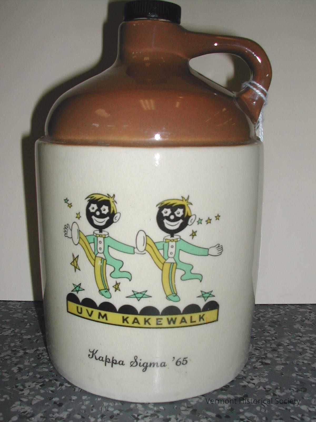 Ceramic jug with a design of two dancing boys in blackface. The jug has a white body and brown top, and it seals with a cork topped with a black plastic lid. The design is applied to the main body of the jug and consists of two male figures wearing green tail coats, yellow pants, and bow ties. They are each kicking their right legs high into the air. They both have blond hair and are wearing black face paint except around the eyes and mouth. They are surrounded by simplistic stars, and are shown above a stage reading, "UVM KAKEWALK". Beneath the design in a script font are the words, "Kappa Sigma '65".Context