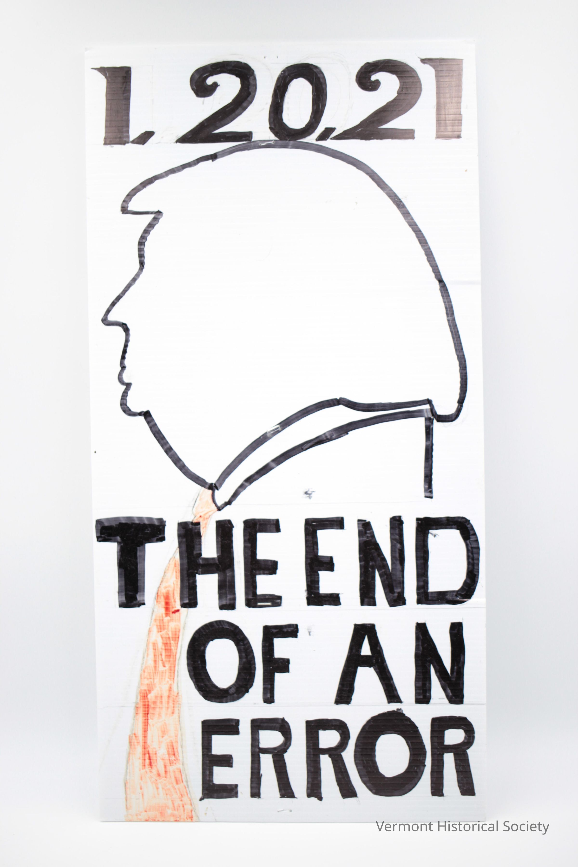 Rectangular sign. The front of the sign is oriented vertically and is hand-decorated with permanent markers with an outline silhouette of Donald Trump with a red tie extending from his collar to the bottom edge of the sign. The top of the sign bears the date, "1, 20, 21" in permanent marker, with pencil marks from drafting the design visible behind. The bottom of the sign bears the inscription, "THE END OF AN ERROR". The back of the sign is oriented horizontally and commercially printed with an alarm clock, the number 4, a wooden block with the letter M, and peach, and a wrapped mint candy ("Time for impeachment").Context