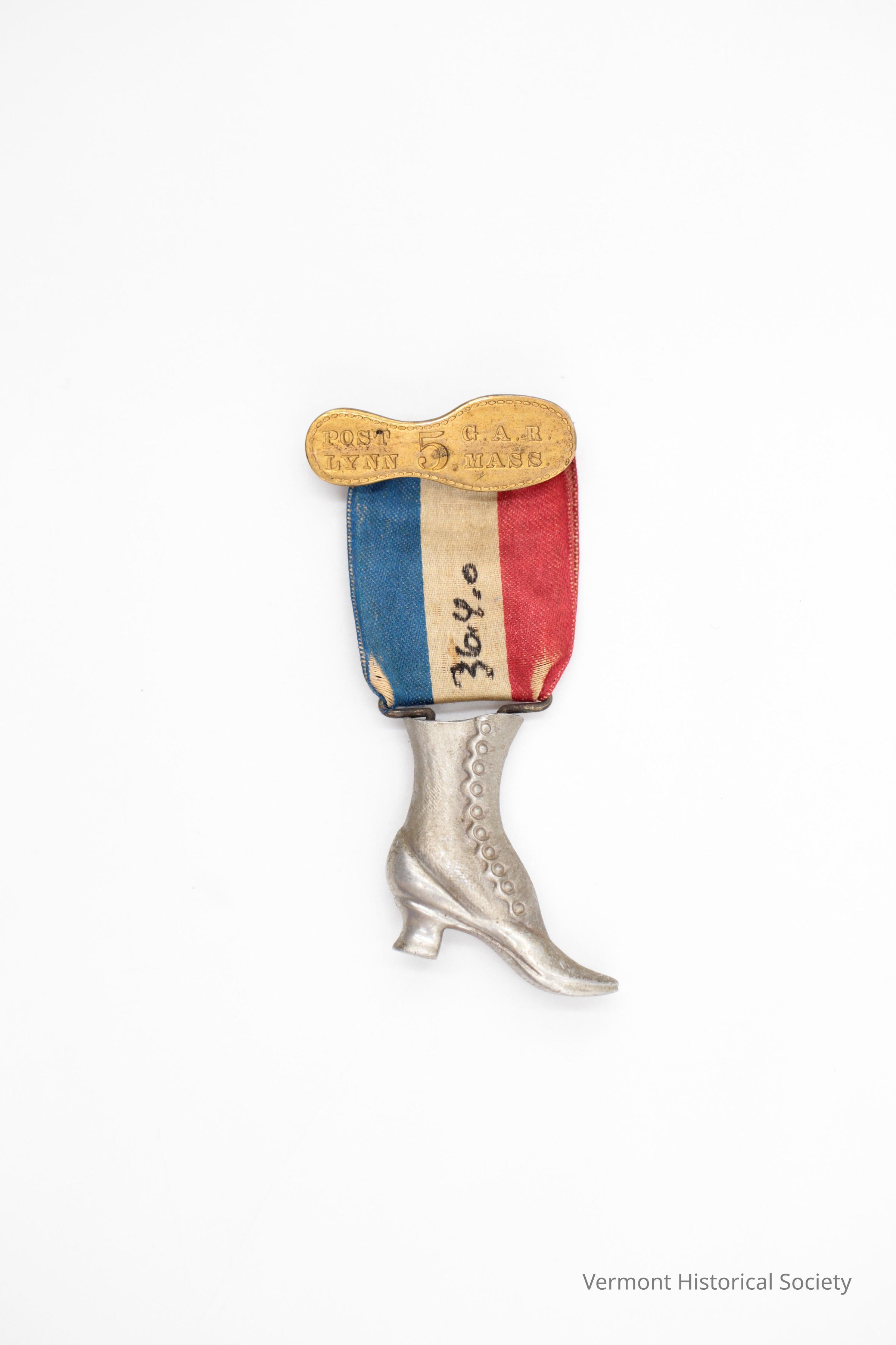 Membership ribbon consisting of a bar, ribbon, and medallion. The bar is gold plated and in the shape of a shoe sole. It has the inscription "POST 5 G. A. R. LYNN MASS." The ribbon is looped and stitched to a wire on the back of the bar, and another wire runs through the ribbon at the bottom, holding a silver medallion in the shape of a woman's boot. The boot has a small heel and buttons up the side.