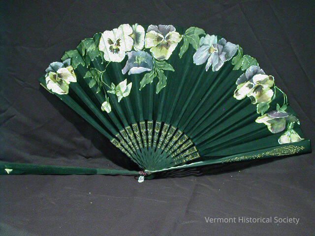 Silk folding fan with black sticks decorated in gold. The leave is painted with naturalistic pansies and irises.