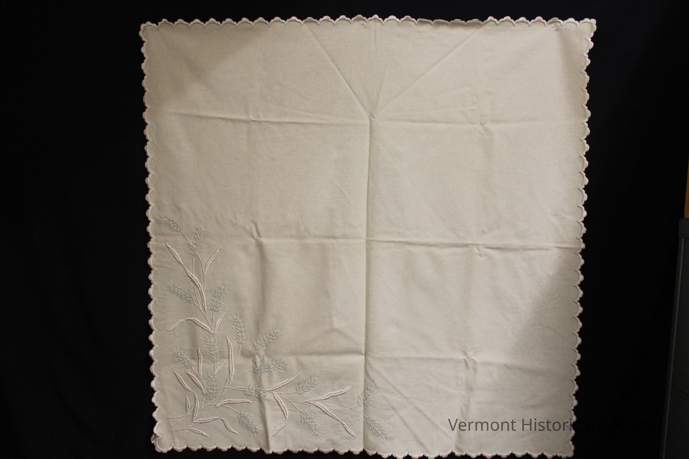 Baby blanket that is made of white wool flannel and adorned with an ornate scalloped edge that is covered with white satin stitch embroidery. In one corner of the blanket, there is a spray of wheat that has also been embroidered using white embroidery, likely silk embroidery floss.Context