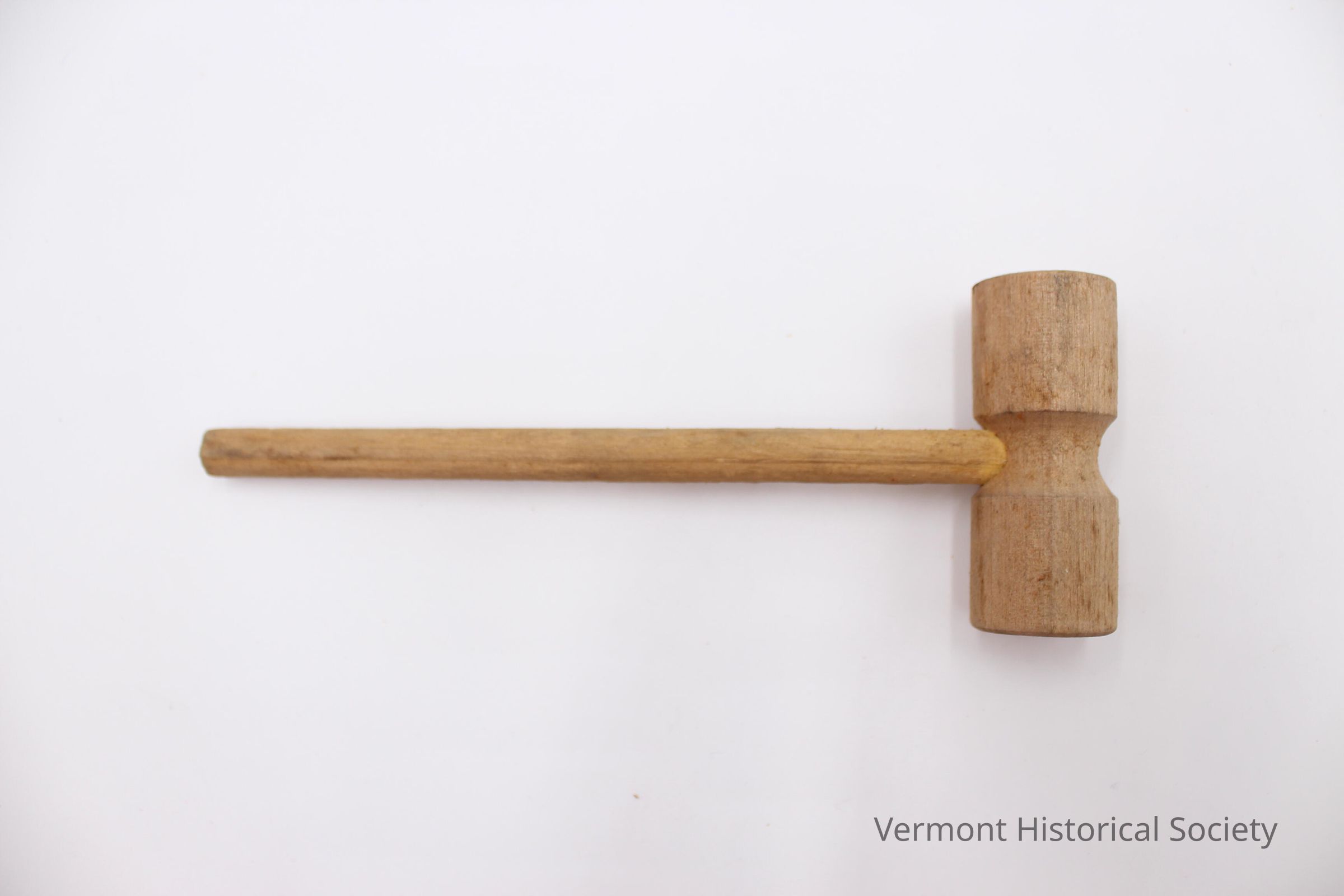 Toy mallet consisting of a turned, cylindrical handle pegged into a small, turned head that narrows in at the center.
