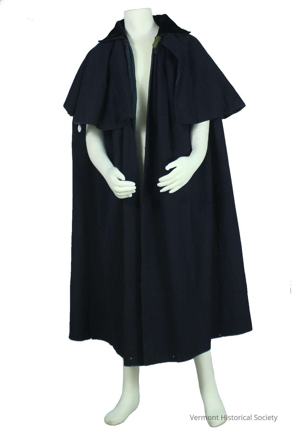 Full-length navy overcoat. The heavy wool overcoat opens down the center front, and has a circular flap from the neckline to the elbow. Instead of sleeves, the coat has side slits that open beneath the upper flap. The wide falling collar is black velvet.