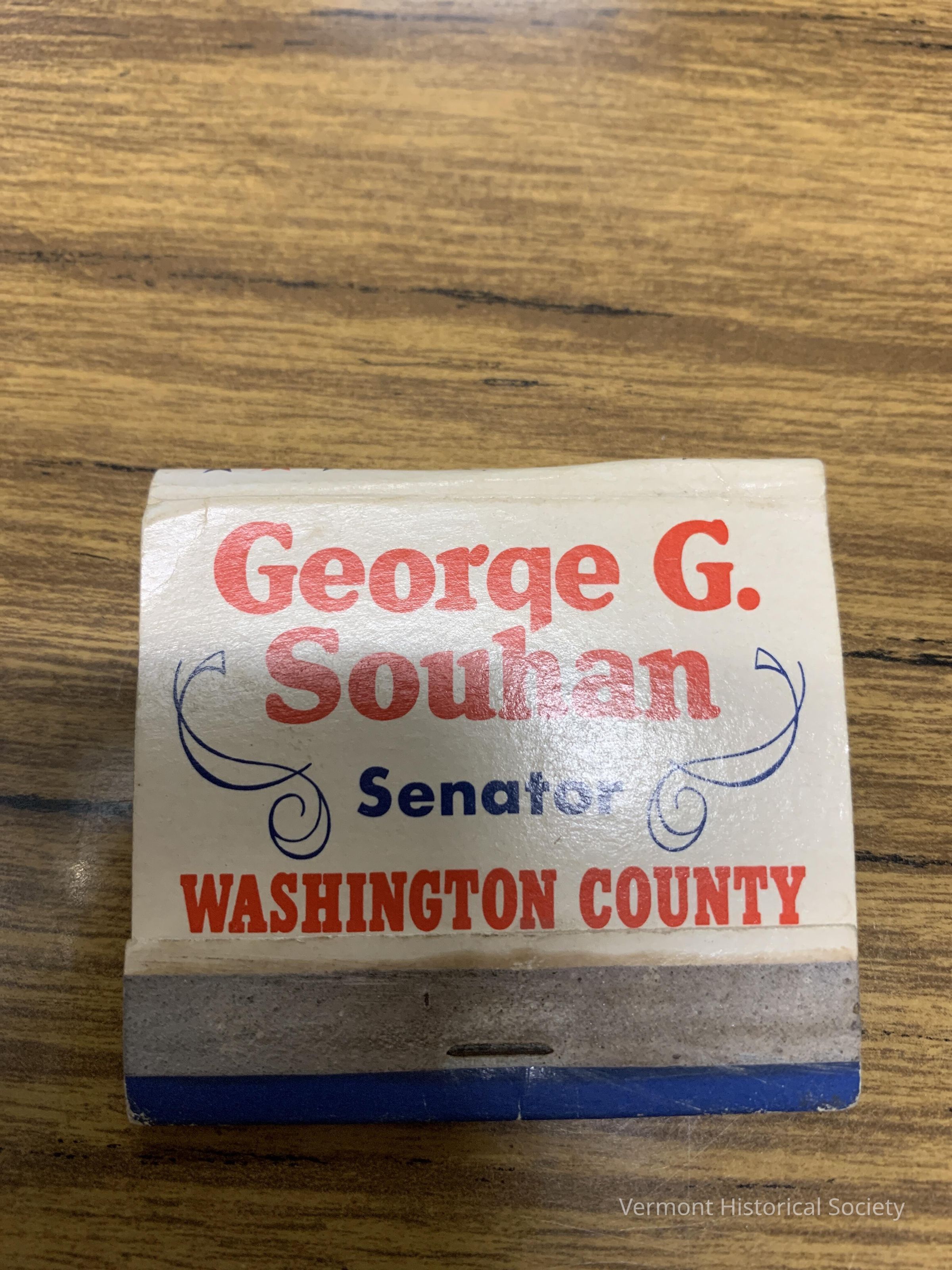 A white matchbook with red and blue lettering that says, "George G. Souhan, Senator, Washington County." On the back is his photograph and his name.Context