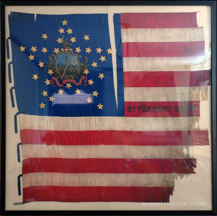 3rd Vermont Infantry Regiment national flag (presentation). Attached to staff by ties. There are 34 gold painted stars that are arranged in a giant star surrounding the Vermont coat of arms.