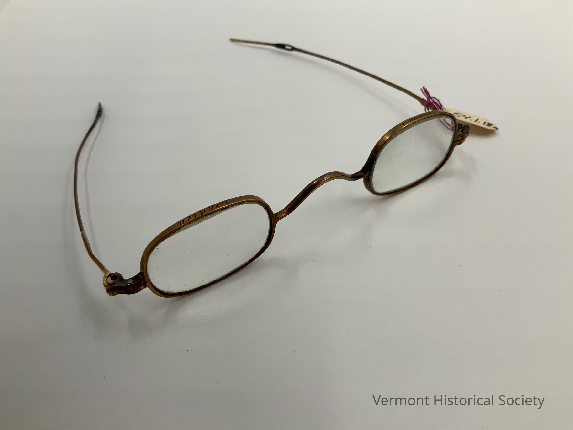 Oval, metal-framed eyeglasses. The upper edge of the frames is engraved with the words, "William A." over the left eye and "Bradley" over the right eye. The temple is stamped with the mark, "BROWN & KIRBY" near the hinge.