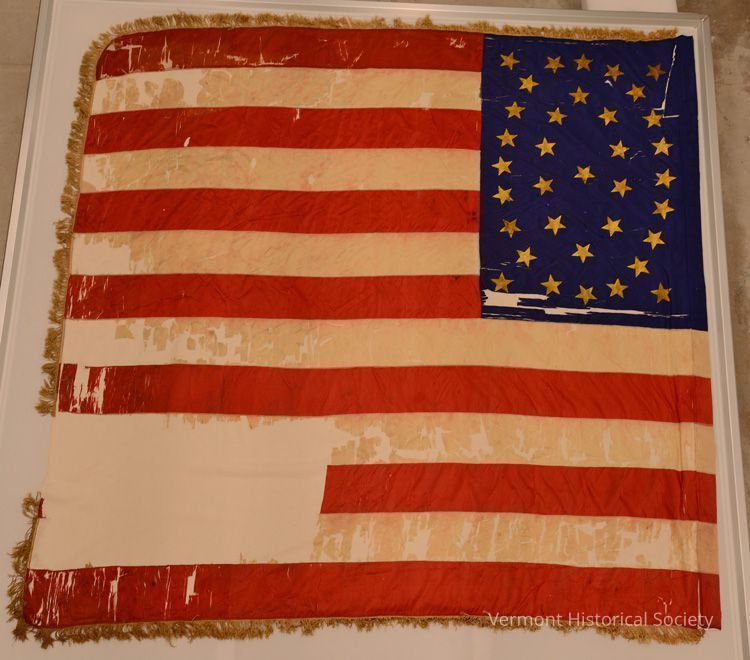1st Vermont Heavy Artillery national flag. Attached to staff by a sleeve. Fringe present. Canton style is rectangular, and is 24 by 38 inches. There are 35 gold painted stares arranged in a double ellipse.