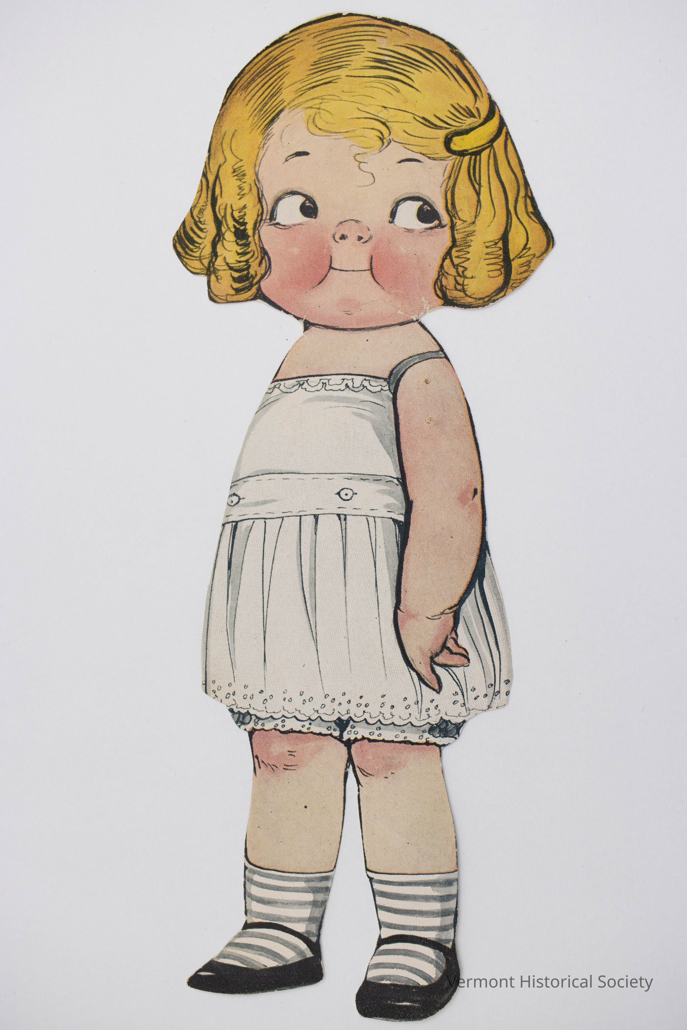 Small paper doll. The doll depicts a young child with yellow hair and pink skin wearing a white dress undergarment, blue-and-white socks, and black shoes. The back shows a portion of a magazine page and the handwritten label, "Tilda".Context