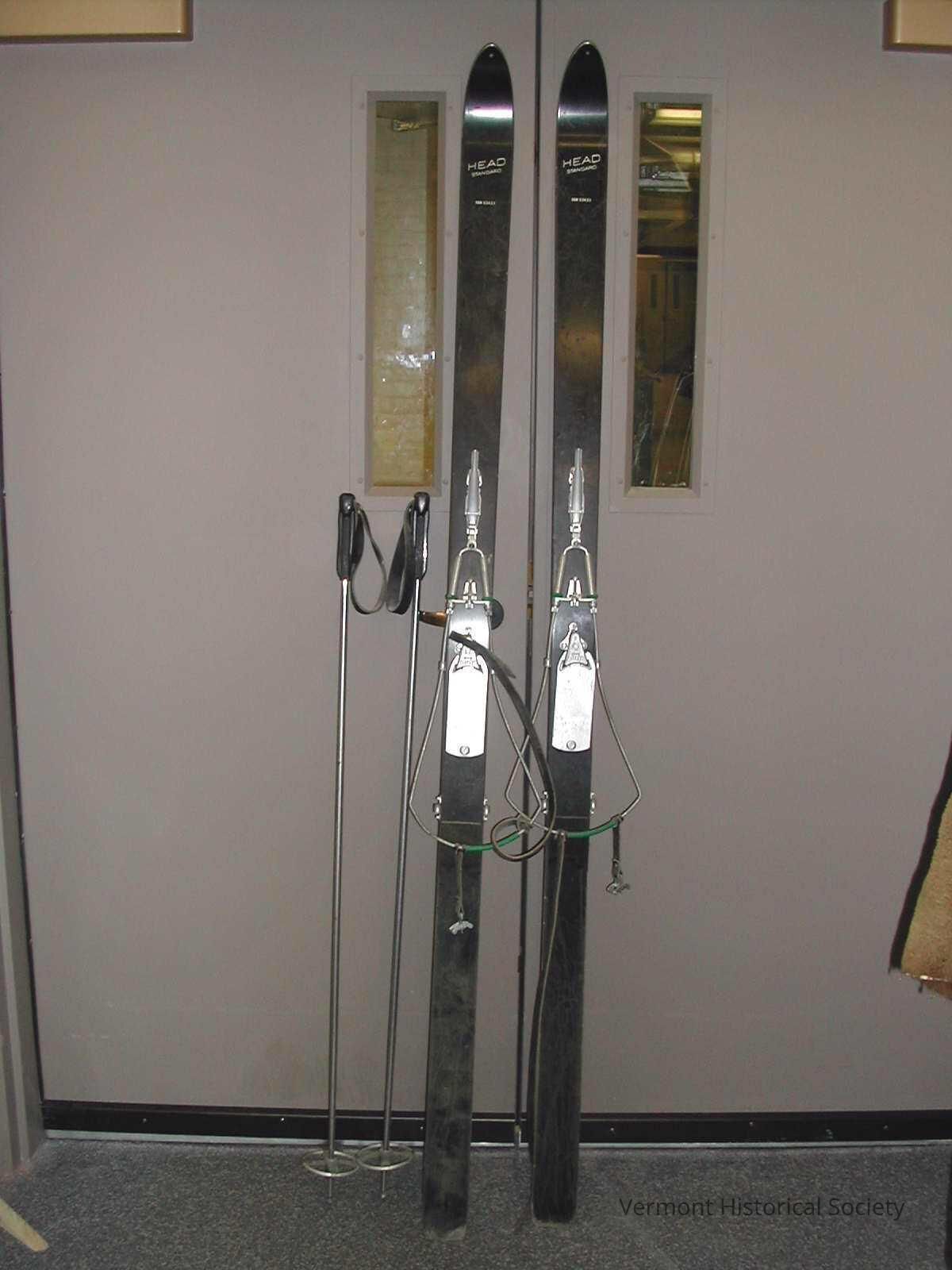 Pair of aluminum skis with poles. The skis are black and labeled, "HEAD STANDARD" near the front. They are mounted in the center with silver-toned metal brackets with raised wires and springs for holding on a foot. The two poles are plated in chrome and have looped straps at the top.Context
