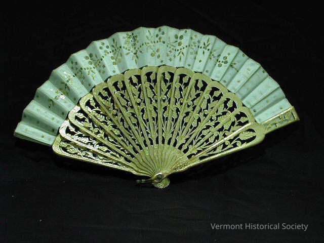 Small folding fan with wide brisé sticks and a short silk leaf. The leaf is painted in gold with dots forming a floral vine and decorated with sequins.
