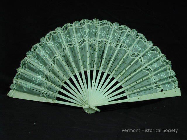 White lace fan with ivory sticks. The lace is decorated with silver sequins and painted flowers.Context
