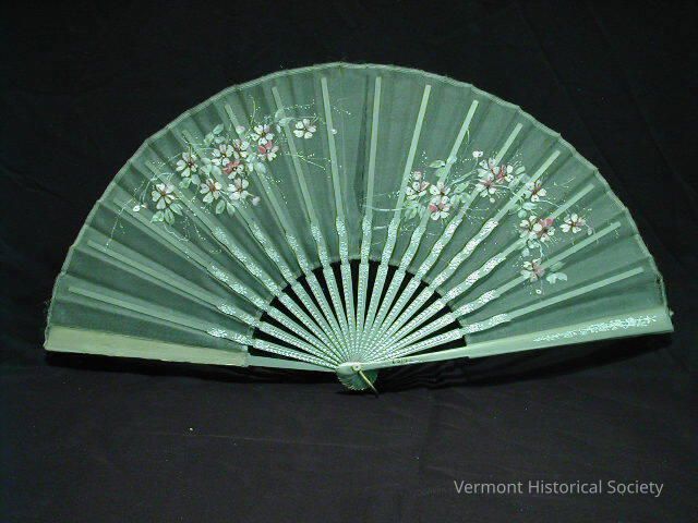 Large, sheer silk fan with silver-painted wooden sticks. The leaf is painted with a design of white and pink flowers.