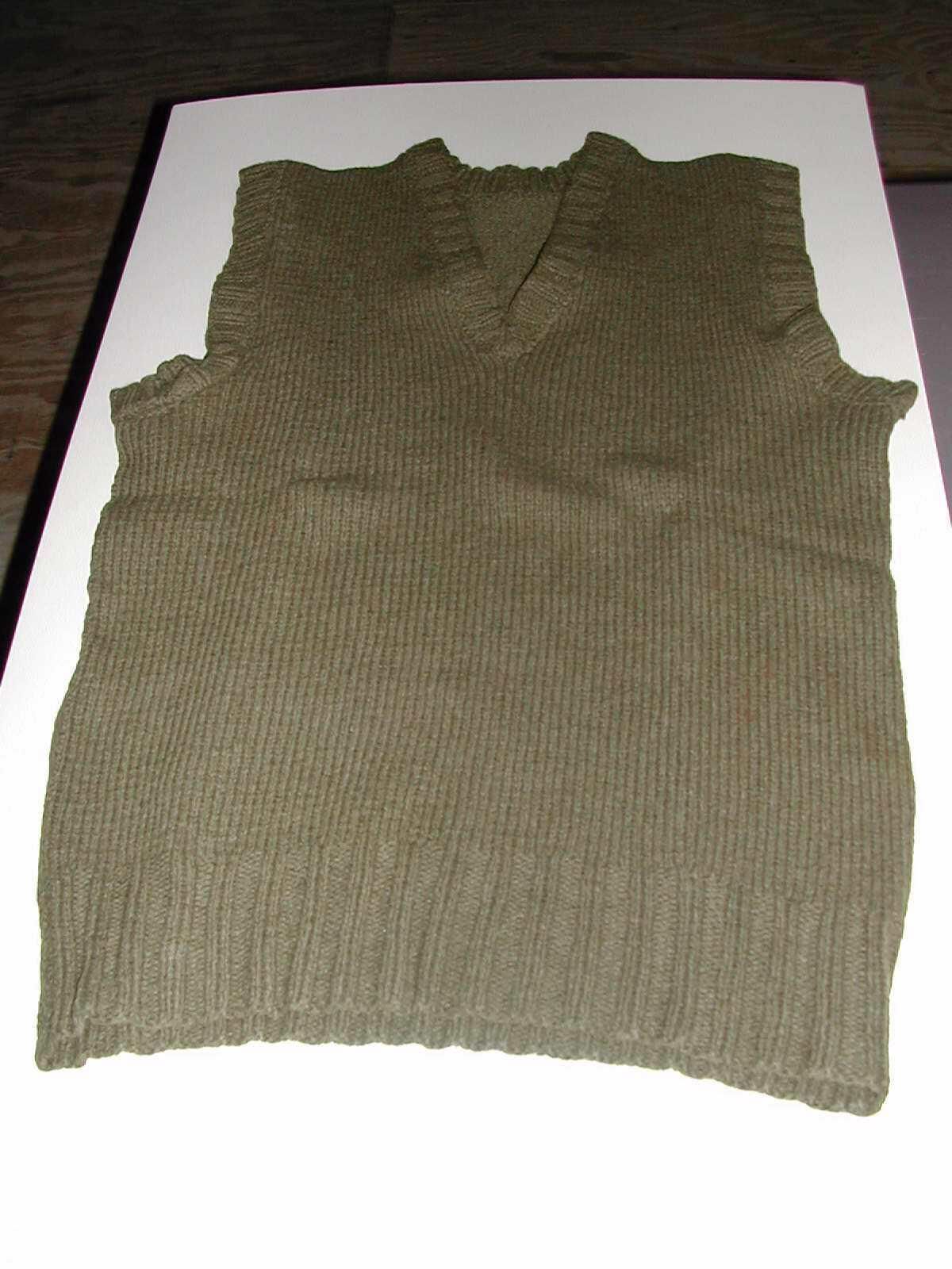 Knitted sweater vest made of olive-green wool. The vest has a V-shaped neckline and no sleeves. The neckline, armscyes, and hem are all cable knitted with the cables oriented toward the edge of the garment.Context