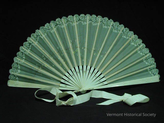 White fan with white carved spokes. Delicately painted sheer fabric top with lace edge. Long white ribbon streamers tied to handle.