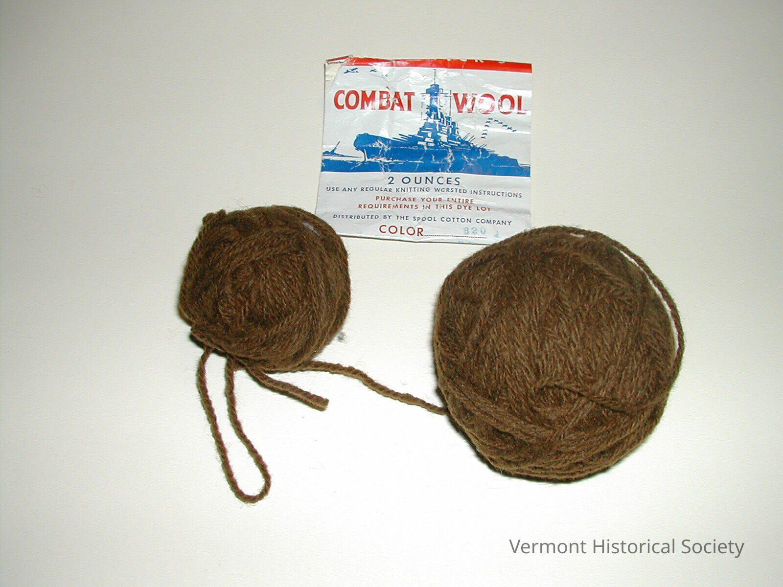 Two connected balls of olive green wool yarn. The yarn is accompanied by a glossy paper label that shows an illustration of a battle ship with the words, "COMBAT WOOL / 2 OUNCES / USE ANY REGULAR KNITTING WORSTED INSTRUCTION / PURCHASE YOUR ENTIRE REQUIREMENTS IN THIS DYE LOT / DISTRUBTUED BY THE SPOOL COTTON COMPANY / COLOR 320 2 / 100% WOOL".