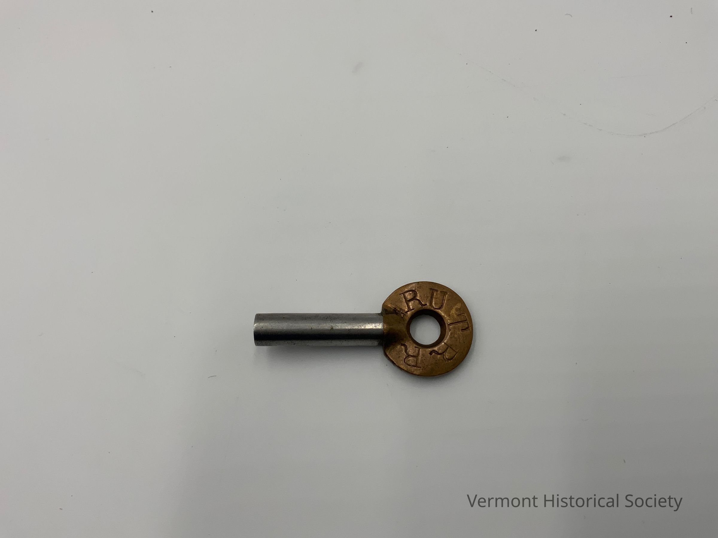 Key with round head. The head is stamped with the label "RUT R R" on one side and "48" on the other side. The end opposite the head has a rectangular hole where the key would be. The shaft is hollow.