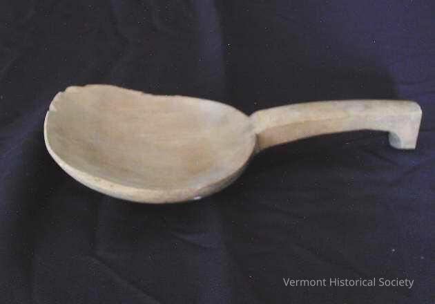 Wide wooden scoop with shallow, round bowl. The bowl and handle are carved as one, and the end of the handle curves perpendicular to the rest.Context