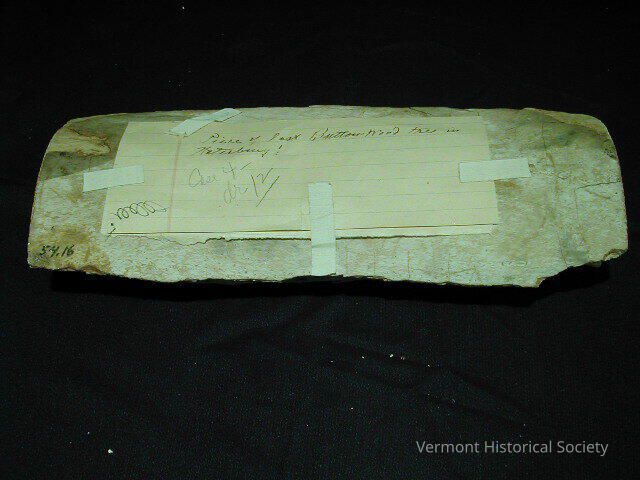 Curved wood fragment with a paper label that reads, "Piece of the last Button-Wood tree in Waterbury". The paper is attached with white fabric tape.