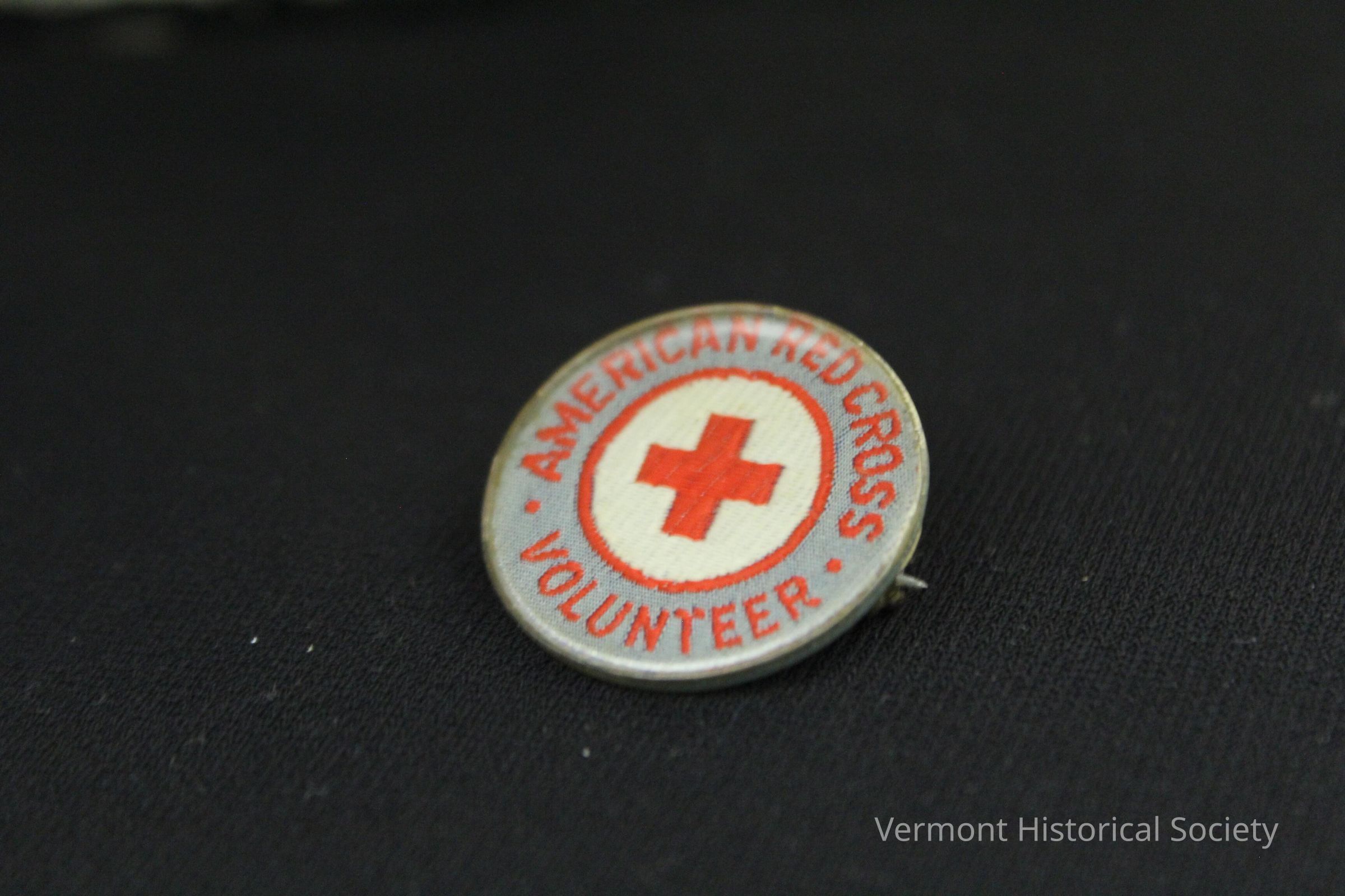 Round button consisting of a textile patch covered in clear plastic. The patch has a red cross in the center with the inscription, "AMERICAN RED CROSS VOLUNTEER", in red on a grey border.Context
