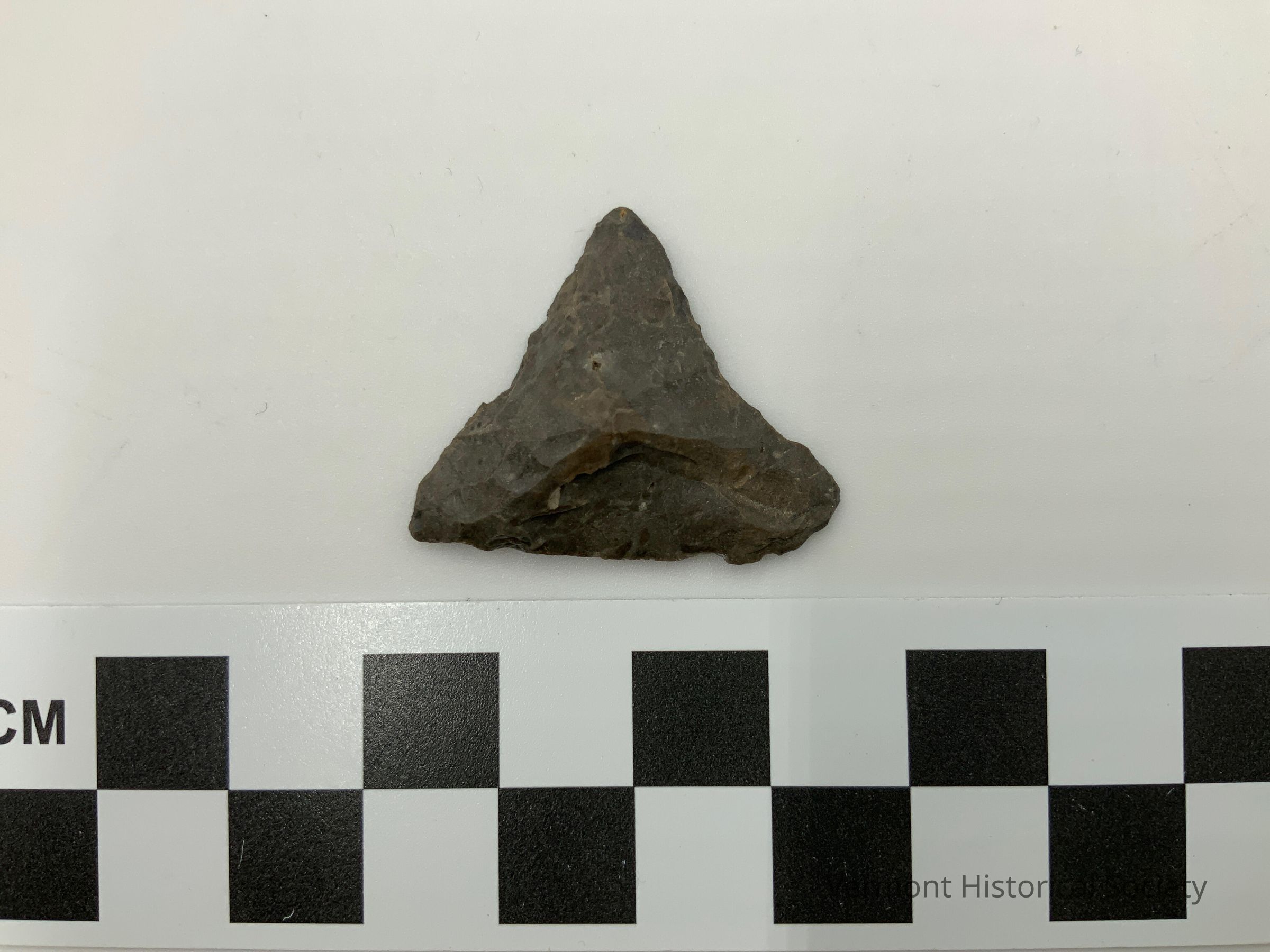 Triangular gray chipped stone projectile point. One edge curves inward. One face is flat, and the other face is sharply domed.Context